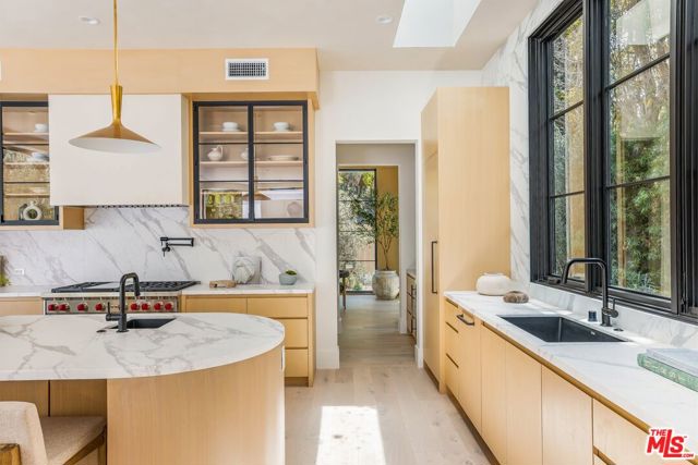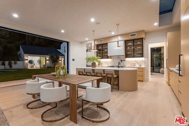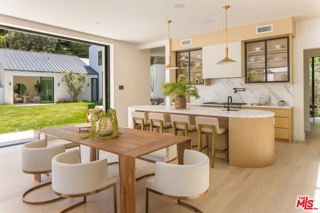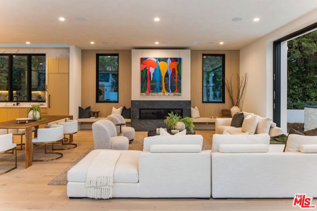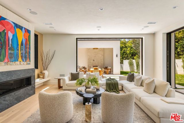 Nestled at the end of a quiet cul-de-sac on a tranquil lane just off the first block of lower Mandeville Canyon, this brand-new construction Modernist Farmhouse blends architectural sophistication with refined, organic design. Set on an expansive 18,000 square foot lot, this estate offers unparalleled privacy and sophistication in one of Brentwood's most coveted neighborhoods. Crafted with meticulous attention to detail, the home's handsome stone cladding and light wood accents seamlessly blend natural textures with contemporary design. A soaring two-story entry with exceptional volume welcomes you into a natural light-filled oasis, thoughtfully designed for both entertaining and everyday living. At the heart of the residence is an expansive great room with artisanal Roman clay ceiling, handsome Black Taj marble slab fireplace, and walls of pocketing Fleetwood glass doors leading to a resort-style backyard with elegant cabana and sparkling pool. Chef's kitchen with Calacatta Aella marble finishes, state-of-the-art Sub-Zero and Wolf appliances, and an open-concept layout that ensures a seamless flow between the great room and formal dining room. Primary suite aerie with vaulted ceiling and elegant spa-inspired bathroom. Three additional bedroom suites up, each with luxurious baths showcasing Misterio marble finishes. Sophisticated downstairs powder room with artful, minimalist raked stucco walls. Captain of Industry office. Spacious state-of-the-art screening room delivers a cinematic experience, while the Control4 smart home automation and built-in surround sound ensure effortless control of lighting, climate, security cameras, and entertainment. Expansive walls bathed in diffused natural light for a serious art collection. A singular, Brentwood estate blending glamorous indoor/outdoor living, comfort, and unparalleled amenities.