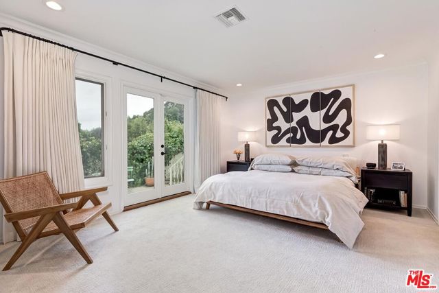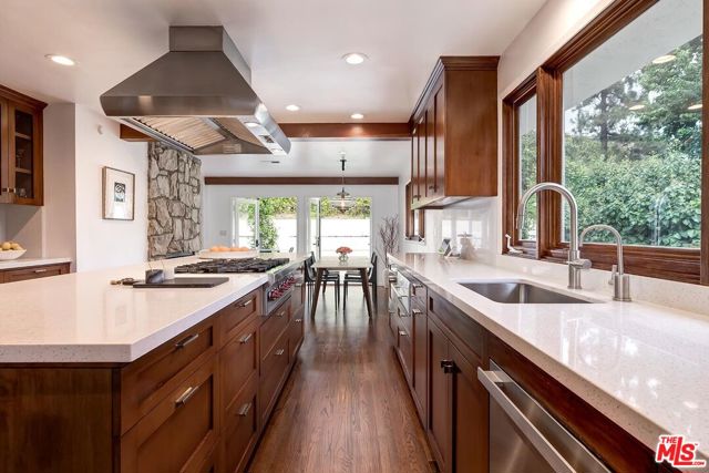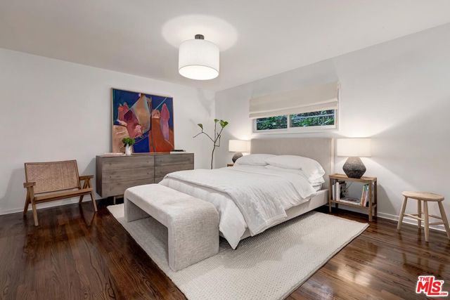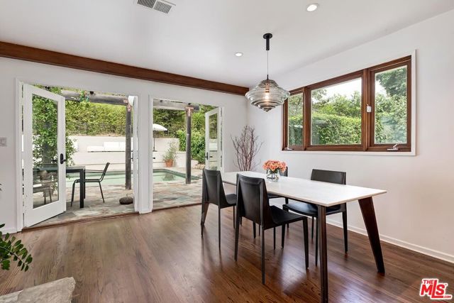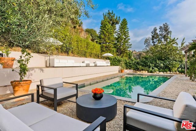 Wonderful resort-like Contemporary home with sensational pool and yard. Enter through a gated court yard to a light and bright living room featuring a wood burning fireplace, hardwood floors and walls of glass. Remodeled open kitchen with large island perfect for entertaining and eat-in dining area. Private primary suite bath and dual closets. There are 3 additional bedrooms, one currently used as a media room and another as a home office. Large glamours outdoors with trellis, marvelous for al fresco dining overlooking the oversized pool and lounge areas. Convenient location minutes to the heart of Beverly Hills or the Valley on a lovely cul de sac street. 2 car garage. A true haven.