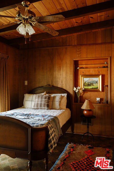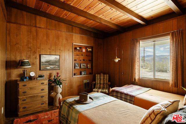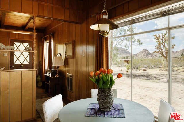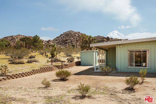 Time to slow down and unwind at Wagon Wheel Hideaway - a 1955 midcentury cabin set on five acres of pristine desert, just five minutes from the entrance of Joshua Tree National Park. Backed against the boulders of Monument Manor, this nostalgic retreat offers a rare opportunity to own a piece of desert history with more than enough space to write a new chapter. Architectural plans have been drawn by the renowned firm Oller & Pejic for a structure that engages in an evocative conversation with the landscape. Cherished by the same family for over half a century, this much-loved vacation home has been a gathering place for holidays and quality time within its cozy two-bedroom, one-bathroom footprint. Attached to the house, a spacious two-car garage includes a storage and bonus room, ideal for a studio or creative workshop. Outside, mature Joshua trees anchor sweeping desert vistas visible from every room. Add a pool, park your Airstream, open up a bygone-era Airbnb, or simply sit back and watch the sky turn orange and violet each evening from the porch- the possibilities are endless. This is the one, a prestigious Monument Manor location, BLM hiking trails up the road, stargazing, close proximity to the buzz of downtown Joshua Tree, and the tranquility of nature right at your doorstep.