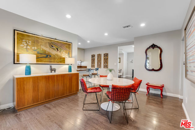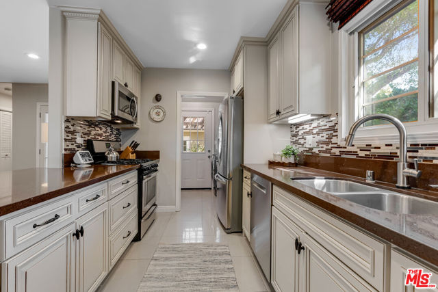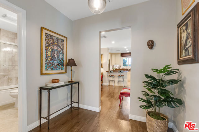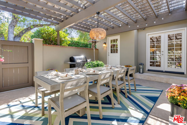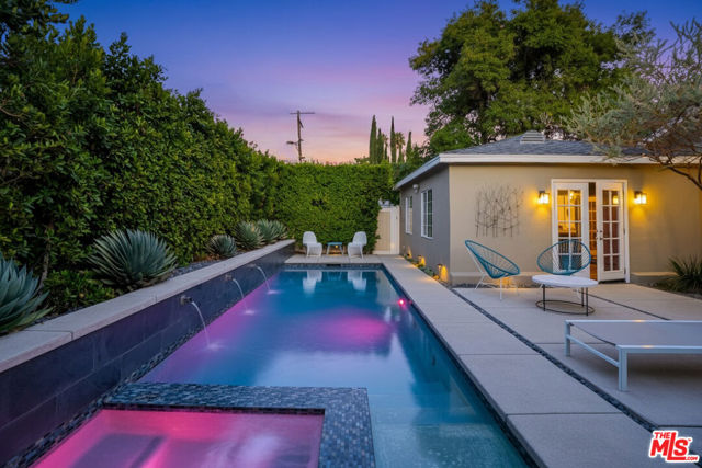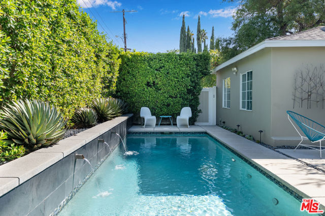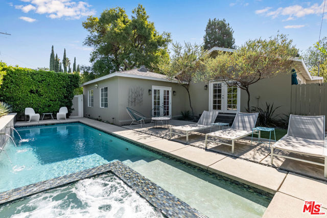 Welcome to your private Lake Balboa retreat. An immaculate single-level home designed for both everyday comfort and unforgettable entertaining. Set behind privacy walls and lush hedging on a corner lot, you'll feel like you've entered your own sanctuary the second you arrive. This 3-bedroom, 2-bath residence spans 1,684 sq ft of thoughtfully updated living space. Beautiful floors flow throughout, leading you to the heart of the home: an open kitchen with breakfast bar that connects seamlessly to dining and living spaces. French doors expand the living area out to a walled courtyard with trellis, creating a natural indoor-outdoor flow ideal for gatherings. A finished garage with custom shelving extends entertaining from the courtyard patio through to the backyard and pool. The expansive primary suite offers a true sense of escape with its custom walk-in closet and spa-like bath with double vanity. Two additional bedrooms are located off a common foyer, and are nicely separated from the primary suite. The custom pool and spa, newly built during ownership, anchor a private backyard oasis, complete with a tranquil water feature, programmable lighting, and outdoor speakers. Drought-tolerant landscaping and an EV charger make the home as functional as it is beautiful. Modern amenities include a smart home system, security system, tankless water heater, central HVAC, and leased solar for energy efficiency. Walk to Lake Balboa park and bike path, golf, and the famous Japanese Garden. Just minutes away are neighborhood favorites such as Katsuya, Super K, Gelsons, Whole Foods, and the famous Springbok Bar and Grill. With its blend of privacy, modern upgrades, inviting spaces, and beautiful grounds, this home delivers the true California lifestyle.