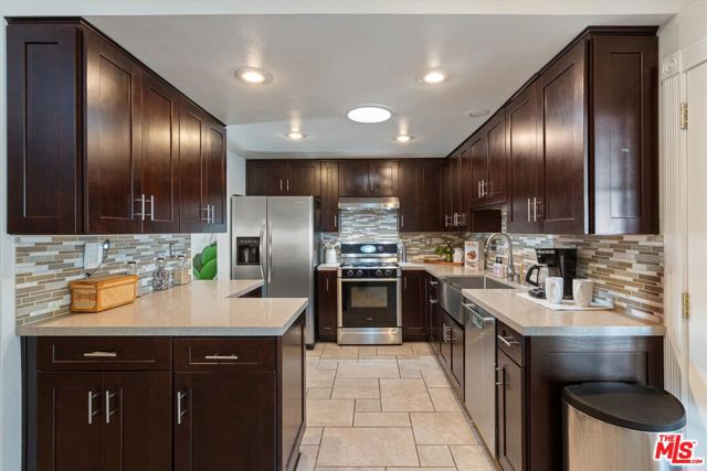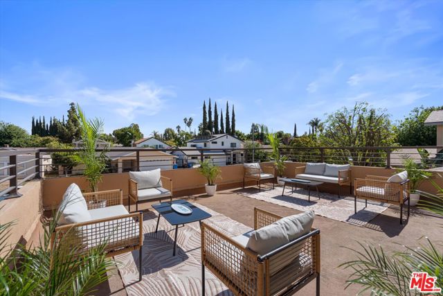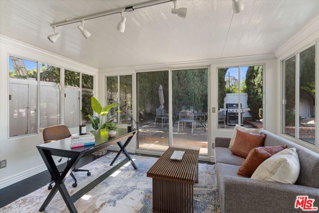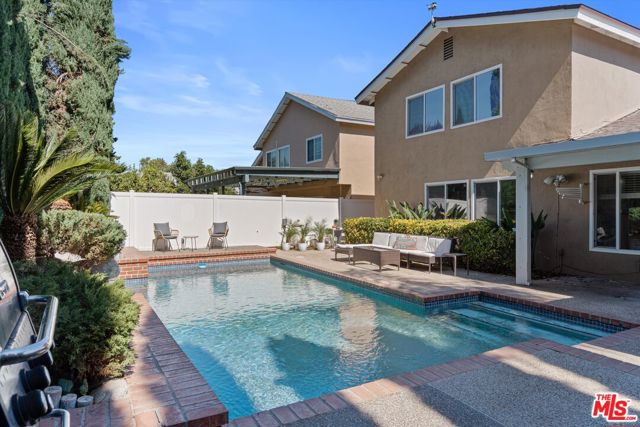 Mid-Century Inspired Retreat in Tarzana... Nestled on a quiet cul-de-sac in one of Tarzana's most sought-after, family-friendly neighborhoods, this mid-century inspired 4-bedroom, 2-bath home offers the perfect blend of timeless design and the relaxed California lifestyle. Step inside to discover bright, spacious living areas with clean architectural lines and thoughtful updates. The inviting living room features a striking vaulted ceiling and cozy fireplace, creating a warm, open space ideal for formal entertaining or quiet evenings at home. The modern kitchen showcases stainless steel appliances, a farmhouse sink, and ample counter space. The main floor includes a large primary bedroom and bath, perfect for guests or convenient single-level living. Upstairs, two additional bedrooms share a full bath and open onto a spacious second-floor patio, perfect for morning coffee, sunset cocktails or evening gatherings. Outside, the secluded backyard is a true highlight: Giant cypress trees set off a sparkling pool, creating a private oasis ideal for relaxation and summer barbecues. Beautifully landscaped throughout and set in a peaceful neighborhood close to parks, local shops, and dining, this home also enjoys close proximity to SOCES the Sherman Oaks Center for Enriched Studies, one of the area's most highly respected and sought-after schools. Combining mid-century charm, modern comfort, and an unbeatable location, this Tarzana gem captures the best of Southern California living. Note: "4th Bedroom" is a "Bonus Sunroom," currently used as an office with separate AC unit; does not currently have a closet, but could be converted.