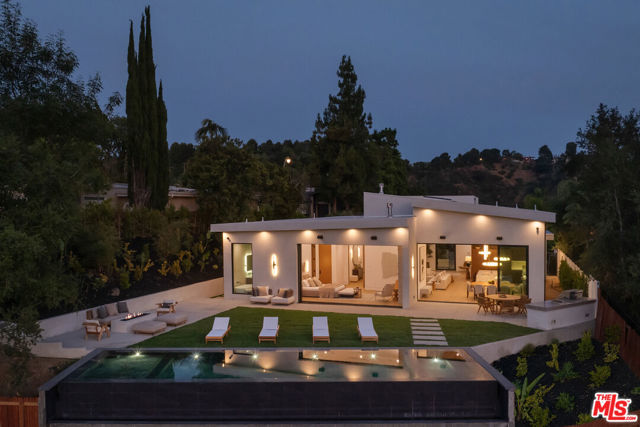 Tucked away on a quiet cul-de-sac in the prestigious Beverly Hills Post Office area, this newly completed modern masterpiece offers breathtaking jetliner canyon views. Privately gated for maximum security and seclusion, the home showcases soaring 18-foot mahogany-clad ceilings, multiple skylights, a dramatic 16-foot-tall library, and expansive sliding glass doors for seamless indoor-outdoor living. The dramatic black-tiled pool, perched on five structural caissons, features a stylish Baja shelf - perfect for lounging in privacy while enjoying the view. Distinctive interior finishes include white oak flooring, Calacatta Cremo countertops in the kitchen, Fantasy Pink marble vanities in the guest suites, and a powder room with Calacatta Picasso marble and Roman clay walls. Custom walnut cabinetry adds warmth and sophistication throughout. The primary suite features a serene sitting area, a large custom walk-in closet, and a spa-like bath with a soaking tub overlooking the stunning views. Outdoors, enjoy a full kitchen equipped with a sink, BBQ, and refrigerator, along with a built-in fire pit perfect for entertaining. Every detail has been thoughtfully curated to elevate both design and function. With world-class finishes and exceptional craftsmanship, this home is a true expression of luxury living.