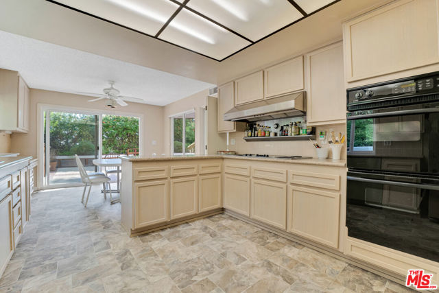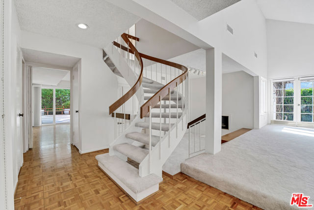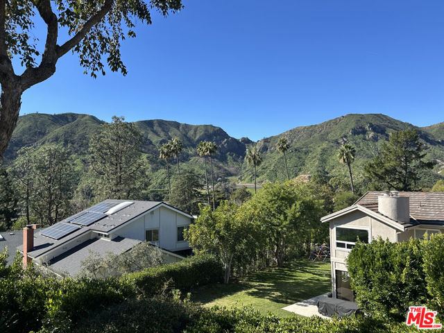 Set at the top of a private driveway and elevated above neighboring homes, this peaceful Palisades Highlands residence offers exceptional privacy along with sweeping green mountain, canyon, and peek-a-boo ocean views. Upon entry, the home opens to an expansive, light-filled formal living area welcomes you, featuring a distinctive sunken lounge complete with wet bar and French doors that open to a large wooden deck - ideal for entertaining. The formal dining room follows, conveniently positioned for gatherings and leads into a spacious kitchen with abundant counter space and storage, breakfast area, and sliding doors that open directly to the backyard. Just beyond the kitchen, you will find a comfortable family room with a dedicated office nook. A guest bedroom with ensuite bath is located on the main level, along with a powder room. Outside, the private rear patio and yard offer multiple areas to gather and relax, with a pass-through window for food and drinks, seated bar, built-in wooden benches, covered and open entertaining spaces, and a grassy side yard framed by mature landscaping. Upstairs, five additional bedrooms include a generous primary suite with a private balcony perfect for morning coffee as you gaze at majestic mountain views. Additionally, a large upstairs patio deck offers additional space to relax and enjoy peek-a-boo ocean views, with stairs leading directly down to the backyard. The remaining bedrooms and office enjoy beautiful views, abundant natural light, and flexible space well suited to a variety of lifestyles. Recently upgraded with new wood flooring, new carpeting and fresh paint inside & out! This is your opportunity to enjoy privacy, scale, and scenic views in the Palisades Highlands, with a floor plan designed for generous living and entertaining. The home offers a new HVAC system, new breaker box, recent roof upgrades, and renovated main sewer line.