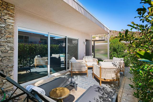 Hidden Gem in the Historic Tennis ClubTucked in one of Palm Springs' most desirable neighborhoods, this single-story condo is the perfect blend of mid-century design and modern luxury. Originally crafted by renowned architect Herbert Burns, the home showcases his iconic style while offering today's most sought-after upgrades--all just one block from downtown.Inside, an open and airy living space features custom cabinetry in the kitchen and bath, sleek modern flooring, and designer finishes throughout. Remote-controlled windows and doors shift from privacy to open views at the touch of a button, while adjustable recessed lighting sets the perfect mood.The only residence of its kind in the community, this condo shares no walls with neighbors--only a garage wall that is not part of the unit -making it the most private home in the complex. It is also the only unit with direct entry from its assigned off-street parking space, where you'll find your own electric car charger tucked neatly into the outdoor storage closet.Step outside to a spacious patio with sparkling pool and spa views, ideal for both relaxing and entertaining.Move-in ready and designed for effortless desert living, this sophisticated retreat is truly one of a kind.