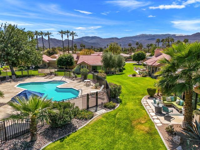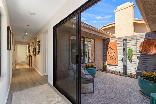 Welcome to Silver Sands RC, THE BEST RACQUET CLUB in the valley! 2 professional coaches onsite, instructional classes and special events. Prime location in Palm Desert, close to El Paseo shopping, adjacent to JW Marriott, across from Desert Willow Golf Resort where Palm Desert residents receive reduced rates. This 1992SF home has 3 bed/3 baths, 2 Patios, Private Courtyard plus an Atrium. Light and Bright decor professionally decorated. Upgrades include kitchen cabinets, New Quartz countertops, Vinyl Plank flooring, natural wood look, throughout ,tile flooring in bathrooms. Breakfast nook in kitchen, bench seating around table. Fireplace has white Stack Stone reface. Enjoy mountains views from the extended back patio. Center Courtyard concrete and tiles refinished last year. New metal gates replaced for privacy. Stainless Appliances, Blue Star Range, New Refrigerator, Bosch DW, completes the Cooks Kitchen. On-suite bathrooms for each bedroom. Built in desk and storage cabinets in third bedroom for office. Plenty of storage primary bedroom has walk in closet, plus a wardrobe cabinet included with purchase.Community has a combination of Desert Landscape and matured shade trees, Green Grassy Greenbelts in the community areas. HOA includes, 8 lighted courts, Gym, 15 heated Pools and Spas. Roofs, Stucco siding, Exterior Painting, community Pest service, Front and Back Landscape maintenance and Cable-Internet is provided by the HOA. Clubhouse activities and Seasonal events are planned by the Social Committee. 2 car garage, new storage cabinets, work bench and storage rack above. The laundry room, utility sink, storage. Water softener tank in garage, serviced by Culligan Water.Air conditioner, Furnace, Hot Water Tank, purchased in 2018-2019. Don't miss this RARE OPPRTUNITY TO OWN the largest floor C plan in a condo community. Gated community with guards attending the gate.Call first to make an appointment. Seller is a Real Estate Agent and a local Interior Designer.