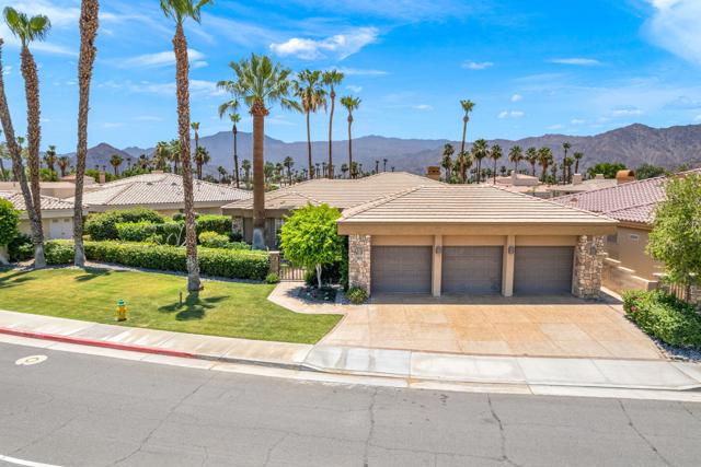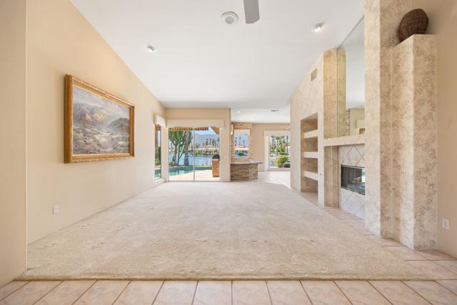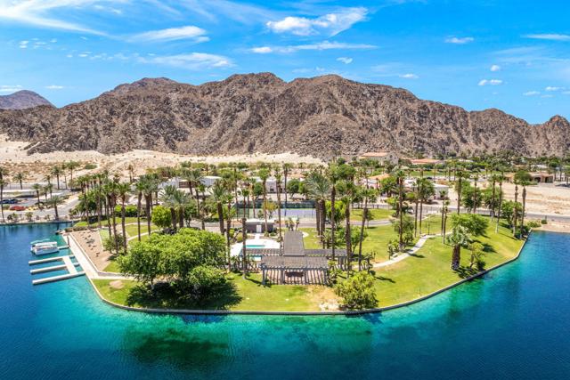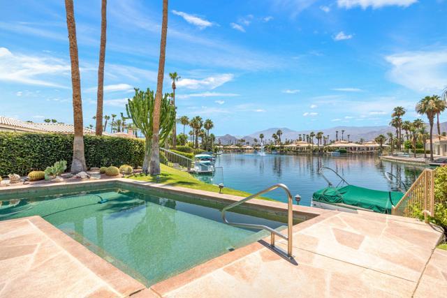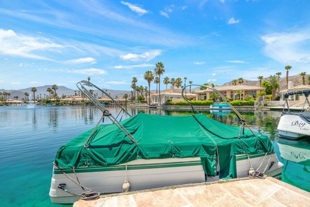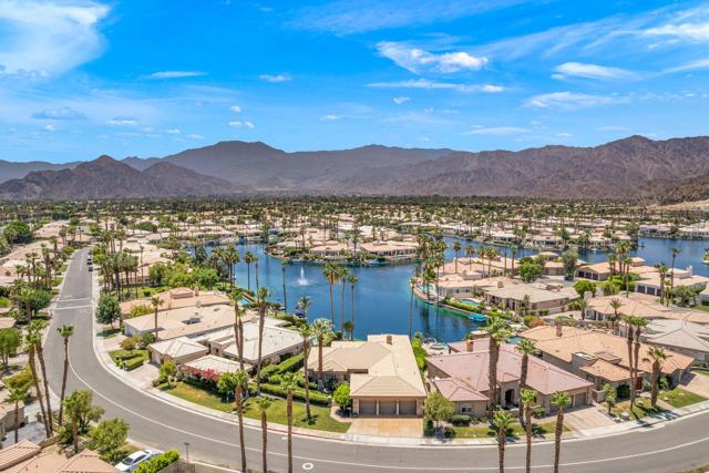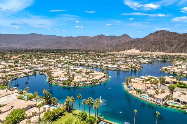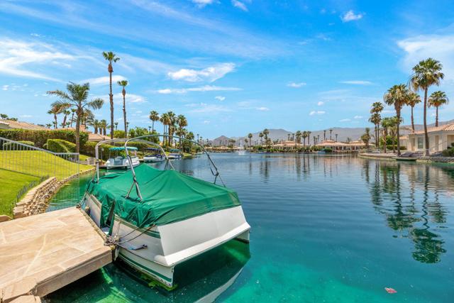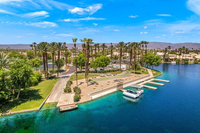Lakeside - Don't miss this rare opportunity for lakefront desert living! With stunning panoramic views of the Chocolate Mountains, this former model home is located in the highly sought-after gated community on Lake La Quinta. Every detail of this property exudes sophistication from its pristine lakefront setting to its meticulously-maintained landscaping. The well-thought-out design maximizes views, providing seamless indoor-outdoor living. It serves as a private sanctuary as well as an entertainer's paradise with a full-sized wet bar, spacious kitchen, outdoor gas barbecue, pool, spa, and electric awning for enjoying the stunning views. Thanks to the private dock, you can cruise around the lake in your own boat. The beauty carries on inside. From your primary bedroom, continue to enjoy mountain and lakefront views with access to your outdoor patio. This room also includes a spacious ensuite bathroom with bathtub, shower, walk-in closet, toilet and separate bidet. Adjacent to the primary bedroom is a second bedroom with an attached bathroom. On the other side of the house is a third bedroom with its own private bathroom. The rooms are spacious yet easy to clean thanks to the central vacuum system. Faux painting on the walls, not wallpaper. A 25 acre community pool, tennis courts, bocce ball and more, a friendly neighborhood awaits. Resort style living with the best views on Lake La Quinta!