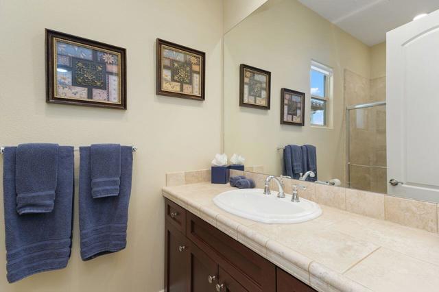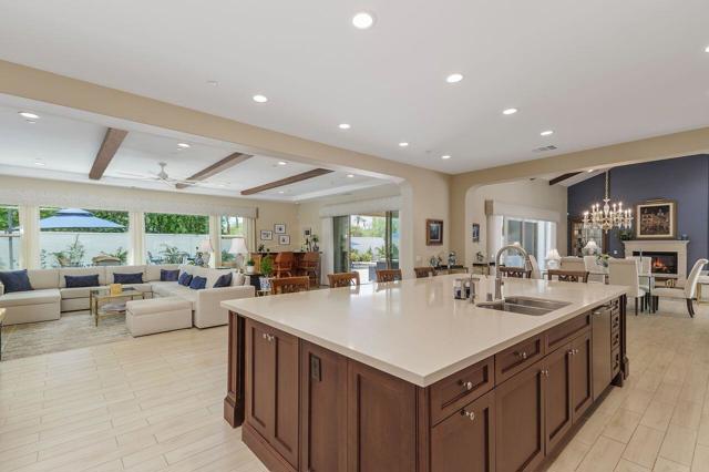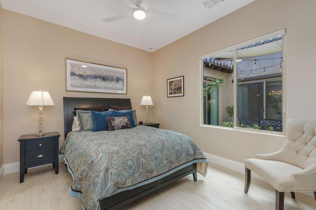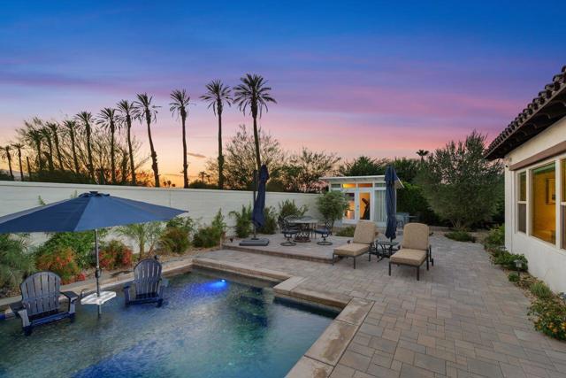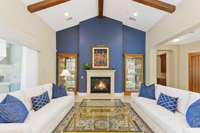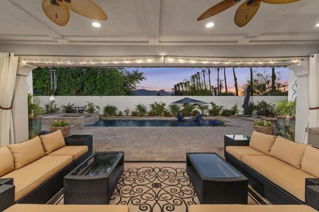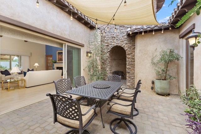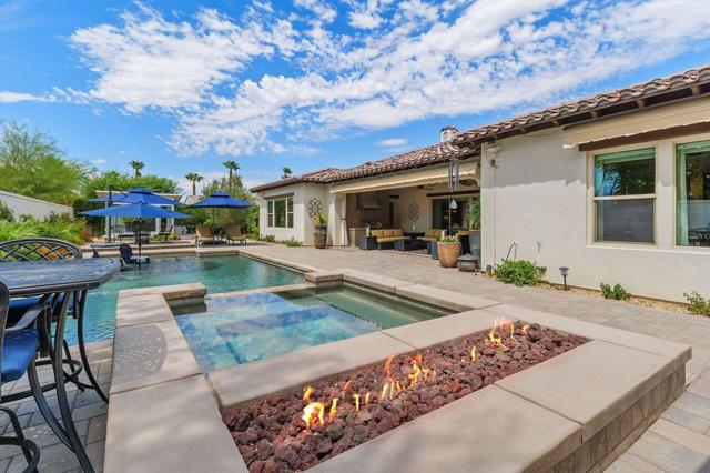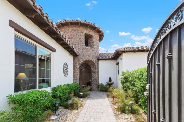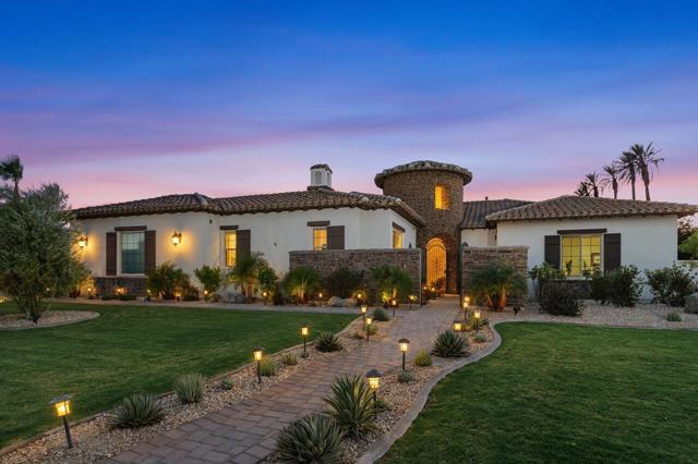 Introducing a rare opportunity to own an upscale Italian Country Estate in the prestigious community of Stonefield Estates. This luxurious 5Bed/5Bath 4,868 sq . home with a 2-room casita suite sits on a half-acre lot. Designed for refined desert living, this well-appointed home features porcelain tile floors and dramatic natural light throughout. From the moment you walk through the custom wrought-iron entry gate and rotunda, the home's elegance and thoughtful design for entertaining unfold. The formal living room/dining room features 14' ceilings with wood beams, large fireplace and custom built-in display cabinets. The gourmet chef's kitchen has a 48'' Sub-Zero, 48'' Wolf range & built-in microwave, and Bosch dishwasher. It features European maple cabinetry, an oversized center island with seating for 6+ persons, quartz counters, eating area and a huge walk-in pantry. It flows into the spacious Family Room with fireplace and bar - perfect for entertaining. The expansive primary suite with built-ins and stepped ceilings provides mountain views and access to the outdoor entertainment area. The spa quality primary bath features dual vanities, marble counters, soaking tub, tiled shower, and custom closet built-ins. The main house includes two additional ensuite guest rooms, an additional bedroom (being used as an office), and a fully renovated powder room. The separate 2-room Casita features a living area with fully renovated kitchenette, bedroom, walk-in closet, full bathroom, 2-sided fireplace, and ceiling fans. It offers privacy and comfort for visitors and/or caregivers with separate entrance from the main house. The private Atrium between the main house and casita features a beautiful private dining area. The backyard oasis is equally impressive and includes a saltwater pool & spa, and a sitting area with a large firepit. The covered loggia features a built-in grill, commercial hood, ceiling fans, TV, and large seating & dining areas with retractable awnings. This fully renovated landscaped property includes a new irrigation system with mature citrus and pomegranate trees. A pool house with 220v power is ready for a mini-split A/C. Upgrades are too many to list, but include a 26kw Generac whole-house generator, whole-house water filtration with reverse osmosis system, ADT security system with cameras, and custom motorized window treatments throughout. This home also includes dual-zone A/C with add'l separate units for the Casita and the four-car garage.
