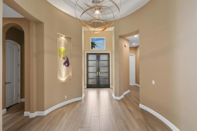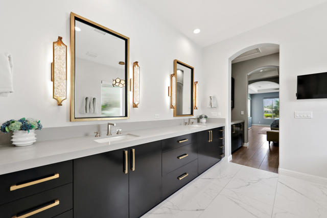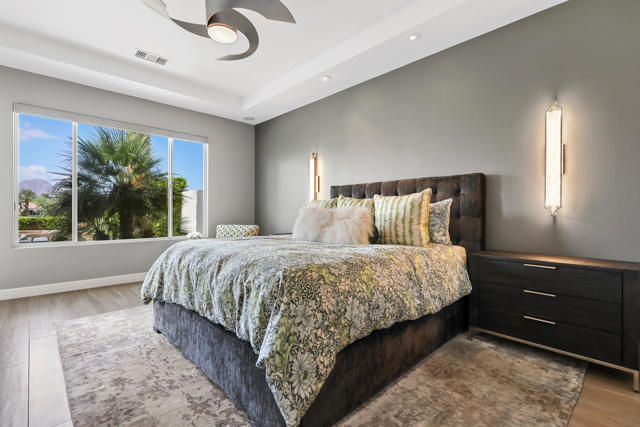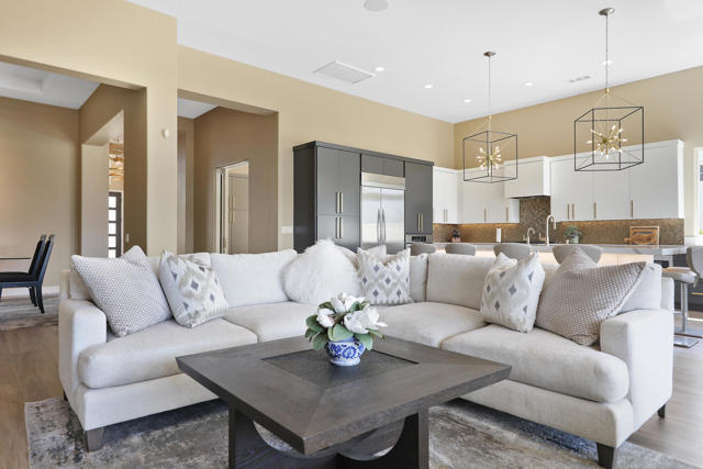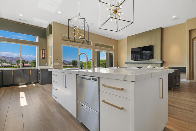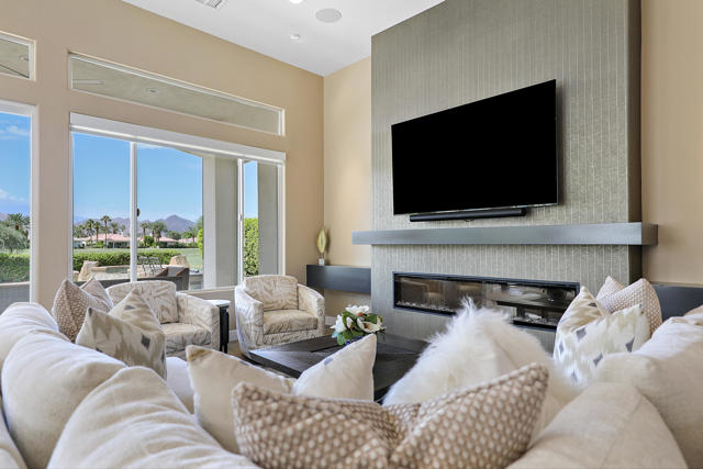 Looking for the show stopper!? THIS IS IT! Fully remodeled Sedona floor plan with jaw dropping mountain views over 2 fairways, grants this home with a special one of a kind allure! No detail was overlooked when renovating this property. When entering, you are welcomed by an enhanced entrance & grand entry double doors as you are greeted with spectacular views, tall ceilings, new flooring, foyer chandelier, graceful glass wall sculptures. This home is adorned with contemporary decor including exquisite custom cabinetry, stunning lighting fixtures, large modern glass fireplace. You will be enticed by a truly entertaining home featuring a gourmet kitchen that expands the length of the entire great room anchored by a bar overlooking the golf course with 2 wine refrigerators & ice maker. The kitchen features large island, new 5-burner Thermador gas cooktop, 2 Fisher & Paykel drawer dishwashers, Zephr hood fan, Sharp drawer microwave as well as Kitchenaid refrigerator & oven. Entertain in formal dining room or on the patio with new BBQ island featuring fire magic windowed BBQ, fire pit, modern patio furniture, new landscape & lights to enjoy breathtaking sunsets. The primary bedroom ensuite includes spa-like bathroom large porcelain tiles, tub, large shower, quartz countertops with exceptional lighting fixtures. The two guest rooms include ensuites, one is currently set up up as an office. An enclosed den/flex room provides optional sleep area for guests with built-ins including desk & closet. Bosch washer/dryer. This stunning home is being offered furnished per the sellers inventory list. One last bonus, it also has a Tesla EV charger!