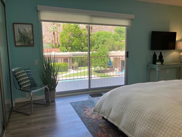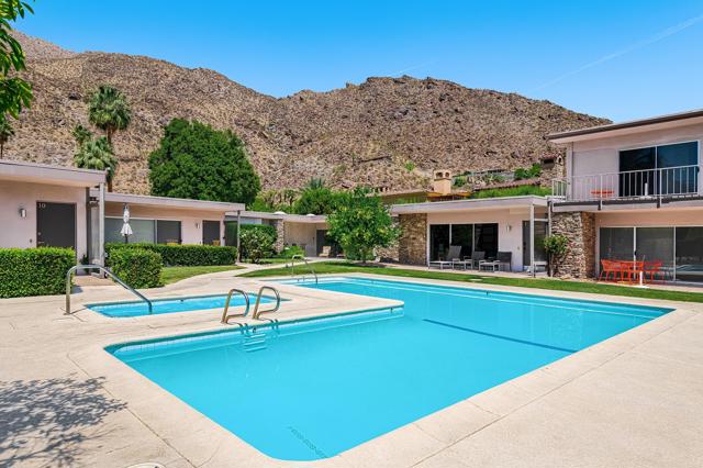 Mid-century design and modern comfort come together beautifully in this two-story condo, created by celebrated architect Herbert Burns. Set in the sought-after Historic Tennis Club neighborhood, the home is just moments from downtown Palm Springs with its lively restaurants, shops, galleries, and nearby hiking trails.Inside, the open-concept layout is ideal for entertaining, with the updated kitchen connecting easily to the dining and living areas. A striking glass-sided staircase leads upstairs to two en-suite bedrooms. The primary suite includes a balcony framing dramatic San Jacinto mountain views, while the guest suite offers European-inspired charm with its rooftop outlooks.Outdoors, a private patio looks onto the sparkling pool and spa, creating the perfect setting to relax or gather with friends. Additional highlights include off-street parking, in-unit laundry, and a complete renovation throughout. Move right in and enjoy Palm Springs living at its finest.
