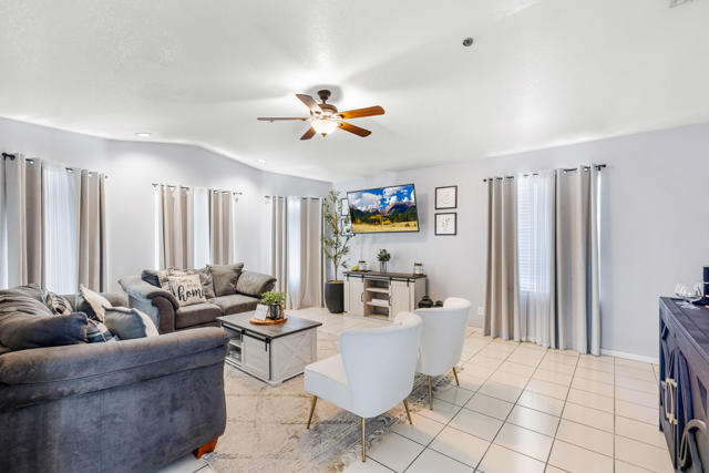 Wonderful home with elevated views that stretch for miles. Built in 1990, this 3 bed / 2 bath, 1,571 sq ft home on a 7,841 sq ft lot makes a stellar first impression with a stylish front facade, new modern white front & garage doors, and gorgeous mountain views from the front. Inside, a long hallway entry opens to an oversized living room with tall ceilings, multiple windows (ideal for custom drapery), and tile flooring throughout. Modern white walls create a gallery feel for art and decor. The large dining area sits adjacent to the functional, practical kitchen with ample counter space. The spacious primary bedroom includes a sliding door to the rear yard; the primary bath features double vanities and dual tiled shower stalls. A spacious second bedroom is currently configured as a large walk-in closet/dressing room (easily converted back), plus a well-sized third bedroom and a second spacious bathroom. Outdoors, enjoy a side patio leading to a large backyard--a great canvas for a custom pool/spa and multiple outdoor living zones, with beautiful exterior mountain views. Laundry in closet. Buyer to verify all information, permits, and pool feasibility with the city.