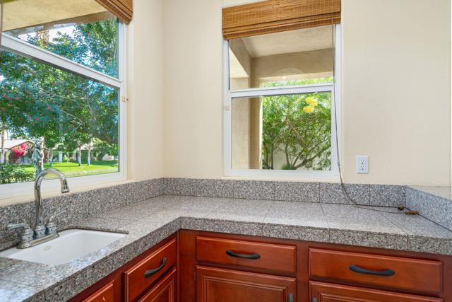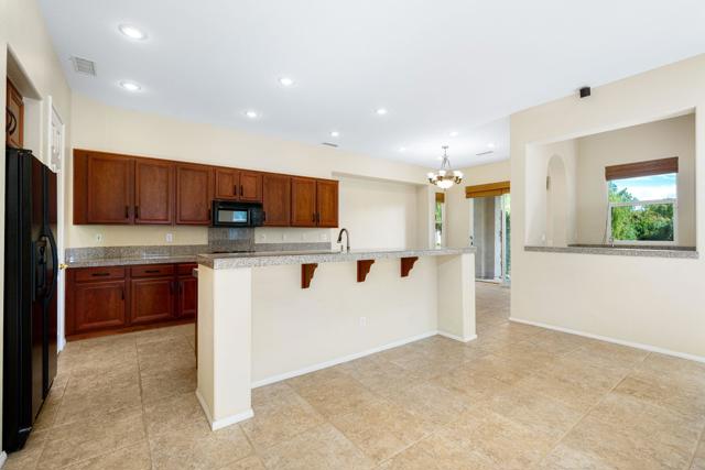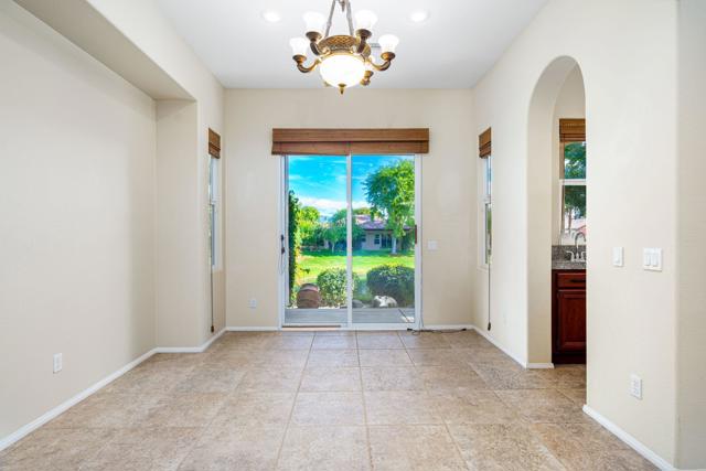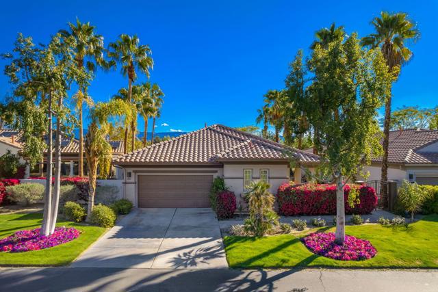 Lakefront with Spectacular Views, Great Curb Appeal, Popular Open Floor Plan and located near Mission Hills Country Club Sports Clubhouse with Tennis/Pickleball Membership Included. Enter through Gated Courtyard with outdoor living and mountain views. Entry Hall leads to Open Great Room with fireplace Kitchen and Dining area all with great views of the lake and fountain. Social Kitchen features granite counters and island with counter seating. Dining area and Entertainer's Bar overlook the lake views. Primary Suite has Retreat area overlooking the lake and Primary Bath featuring dual vanities with marble countertops, shower and a soaking tub. Extra large Primary Closet has custom built-ins. Guest Suite is like a casita with a slider to the courtyard terrace, an ensuite bath and walk-in closet. Second Guest Bedroom and bath nearby give room for friends and family or an office. Outside are expansive lakefront terraces for dining and living and courtyard with mountain views. Mission Hills Country Club Sports Membership included in HOA (tennis, pickle ball, croquet, gym, social). Great value at this price - come home to your lakeside desert retreat!