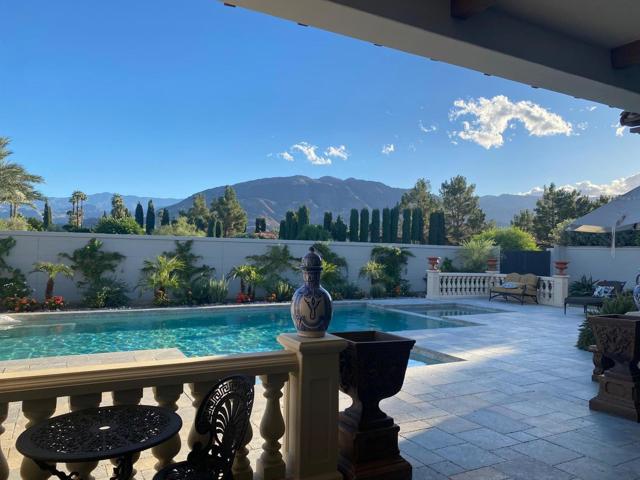 Only minutes away from El Paseo, The River and the new Disney Cotino development, hidden behind the gates of Bella Clancy this home is on a prime cul-de-sa lot with stunning views of the southern mountains, the Best in Bella Clancy. Old world charm of a Tuscan Villa! the owner spared no expense with the custom designer upgrades. From start to finish every detail of each room was being transformed into a visual delight, like a piece of art. This smart home intergrates the latest entertainment, security and convenience technologies. There are 5 bedrooms and 5.5 bathrooms. The primary suite is situated to allow privacy separated from the addional 4 ensuites. With 4,864 SF there is plenty of room for family and friends. The Great Room with a generous dining area allows for many gatherings small or large. The kitchen is a ''true'' chef's delight with upgraded appliances including a built-in wine refrigerator, quality cabinetry and gorgeous slab Quartzite countertops with sit-up island and a cozy breakfast area with built-ins that is adjacet to the backyard. The front gated courtyard entry prepares you for many delights of outdoor living. From the secluded sitting area with overhead trellis that is situated with easy access to the interior with large glass sliders. The backyard has lush landscaping that includes various citrus trees and an inviting custom pool with spa. And the View...Truly Spectacular morning or evening! The great room has tall soaring pocket sliders that allows the view to be seen from inside. There are custom balustrades that adds a coziness to the large covered patio that includes a visually inviting fireplace and convenient BBQ area.There are two separate 2/car garages. The owner has creatively used one garage as a family/friends/owner entertainment room with a mini-split air conditioner and walls of custom cabinetry. This can easily be converted back to garage usage. This property is truly a dream home with a great location. convenient to easy freeway access, hospitals and shopping centers close by.