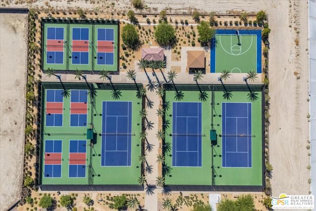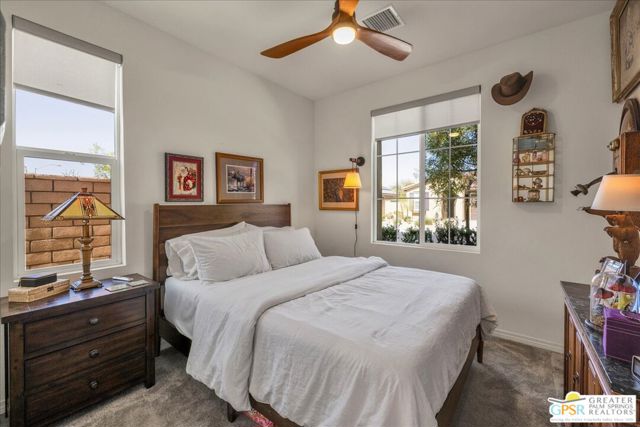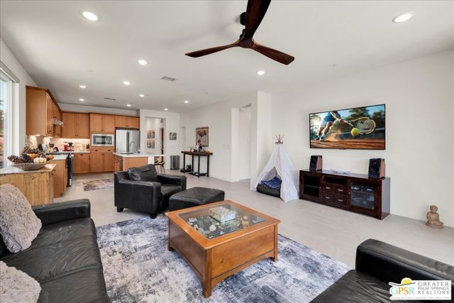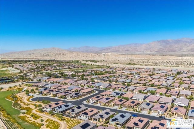 Price Reduced to $445,900 and ready to be sold! Fully owned solar over a $25,000 investment paid in full by the sellers delivers exceptional energy efficiency and long-term savings in this stunning home located in Four Seasons at Terra Lago, a premier 55+ active adult, resort-style community surrounded by breathtaking mountain views. This immaculate, move-in-ready residence features 2 bedrooms plus a den/office, offering flexible space for work, guests, or hobbies. The open-concept layout showcases tile flooring, a spacious kitchen island, and a beautifully upgraded kitchen with premium cabinetry, elegant countertops and backsplash, stainless steel appliances, built-in microwave, and a walk-in pantry perfect for entertaining. Enjoy IID electric service with lower utility rates, a low-maintenance landscaped backyard, low-maintenance desert landscaping, and a covered patio ideal for relaxing while taking in mountain views or nearby casino fireworks. The garage includes golf cart parking and two 4x8 overhead storage racks for added convenience. Just over three years old, this home blends modern comfort, thoughtful design, and energy-smart living. Located close to Acrisure Arena for hockey, concerts, and major events, plus a nearby public golf course at Terra Lago with no membership required. Residents enjoy access to the Four Seasons clubhouse featuring resort-style pools and spas, pickleball and shuffleboard courts, a state-of-the-art fitness center, and a vibrant social calendar all within a gated community designed for the ultimate desert lifestyle.