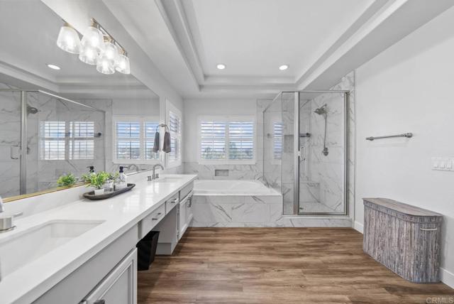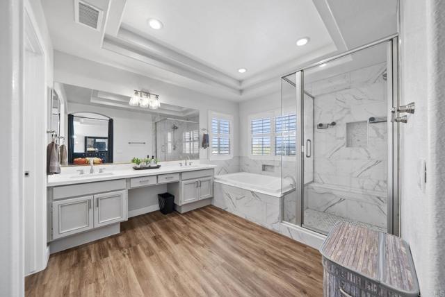 Indulge in elevated Redhawk living from this immaculate two-story home tucked away on a peaceful street with no rear neighbors and incredible views. With great curb appeal, solar energy efficiency, and a spacious three-car garage, this property delivers both beauty and practicality in one of Temecula's most desirable communities. The striking residence offers approximately 2,450 square feet of living space with 4 bedrooms and 2.5 bathrooms (the 4th bedroom is currently utilized as a loft space). Step inside the grand entry to be greeted by soaring ceilings, a statement wall of windows, and a cozy fireplace that anchors the formal living room. Adjacent, a formal dining area sets the stage for entertaining and seamlessly connects to the open kitchen and family room. The kitchen exudes brightness and charm, showcasing custom cabinetry with under-cabinet lighting, stainless steel appliances, a center island cooktop, and a breakfast nook illuminated by natural light. The space opens to the inviting family room, with fireplace and sliding door access to the backyard — perfect for indoor-outdoor flow. Upstairs, the stunning primary suite is a true retreat, featuring tray ceilings, another fireplace, and a private balcony overlooking the serene hillside. The spa-inspired ensuite bathroom boasts an oversized walk-in shower with marble finishes, a soaking tub, dual sinks, a dedicated vanity area, and recessed lighting throughout and incredible walk-in closet. Additional highlights include plantation shutters, a dedicated laundry room with sink, counters, cabinetry, and hanging space, and a low-maintenance backyard with a spacious slab patio ideal for relaxing or entertaining under the Temecula sky. Enjoy the best of the Redhawk lifestyle — top-rated schools, golf courses, nearby shopping, and convenient freeway access — all while savoring the privacy, views, and comfort of this beautifully maintained home.