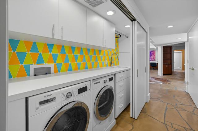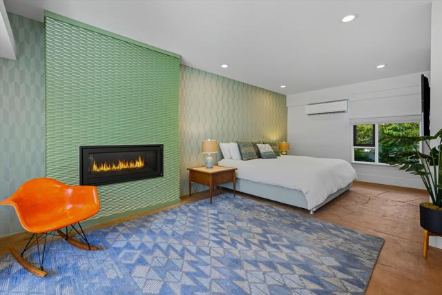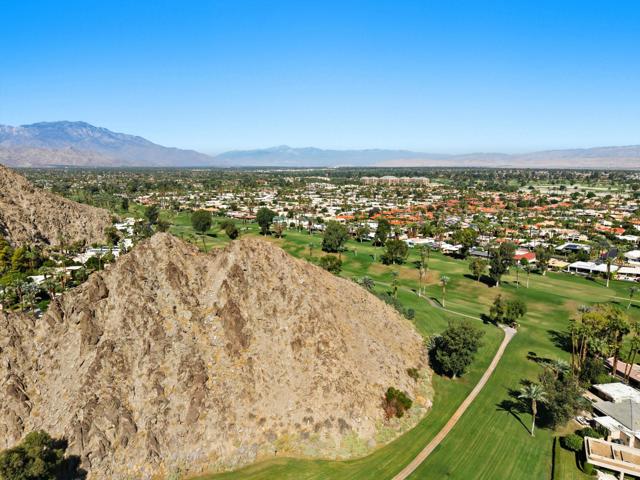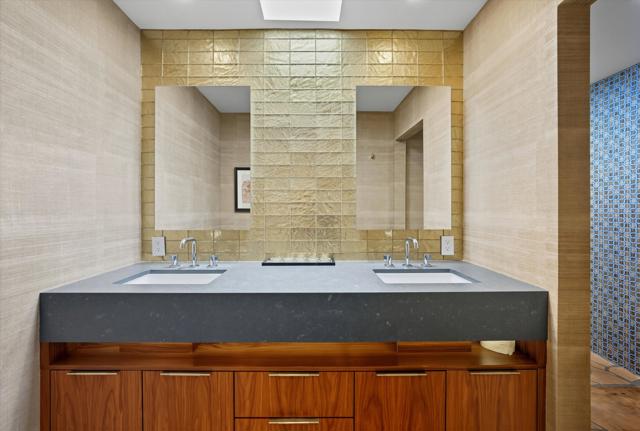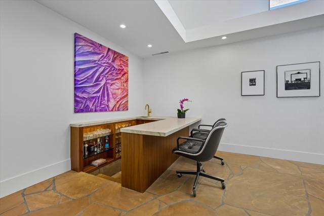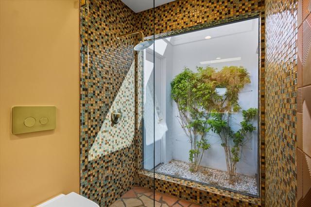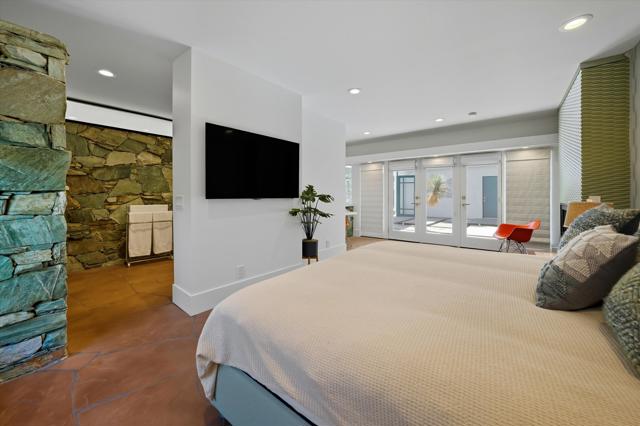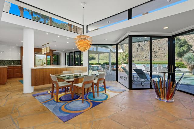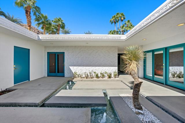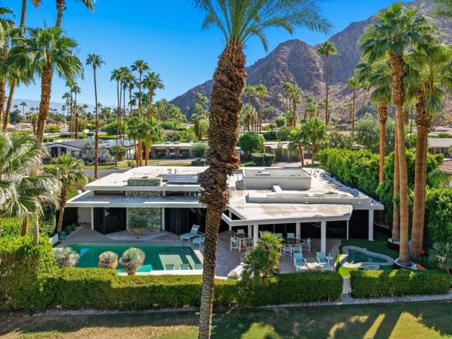 Stunning 1963 Mid-Century Modern, remodeled in 2019, captures expansive South Mountain and Indian Wells Fairway views while offering exceptional privacy. The front elevation with iconic Utah Jade stone facade and circular drive are immortalized in a Carrie Graber artwork, available at Coda Gallery, which sets the tone. A front courtyard wall of obscure glass provides natural light, privacy and leads to the main entry, Casita, and Guest suite. Mid-Century imagination comes alive with the geometric concrete water feature which is the courtyard floor. Inside, the Great Room impresses with a dramatic wall of angular glass and transom windows spanning the width of the home. Flagstone flooring flows throughout, anchored by a striking Utah Jade fireplace. The Great Room with a wet bar, large kitchen, and Primary suite open to the pool, spa and large patio with sweeping views of the South fairway and mountains. The flexible Media Room includes a large screen TV, a 3/4 bath and could serve as a 4th bedroom. A see-thru fireplace connects to the spacious en-suite Casita with private entry and offers a romantic element. Both the Primary and Guest suites enjoy remodeled baths with large showers. The 2019 renovation offers owned Solar electricity and showcases walnut cabinetry, custom shades, quartzite counters, high-end Blue Star appliances, a Thermador wine cooler, and a well-appointed kitchen with a generous island which opens to a covered patio area perfect for dining.Resort-style outdoor living includes a pool with tanning shelf, spa, two fire pits, built-in BBQ with dining counter, and a large covered patio with redwood bench seating, perfect for large parties. A 2-car plus golf cart garage has just been refinished with epoxy flooring. Large side hedges separate this from the neighboring homes for privacy. This beautiful home is offered furnished per inventory and, ready for immediate occupancy. Located in Indian Wells Country Club behind the Manitou Gate, with low HOA dues and enjoys all the Indian Wells perks offered to residents.