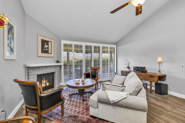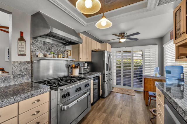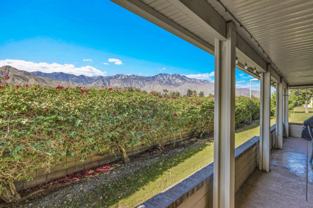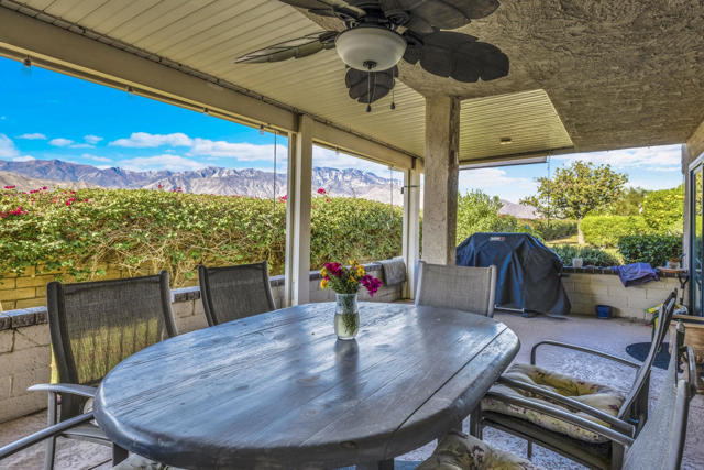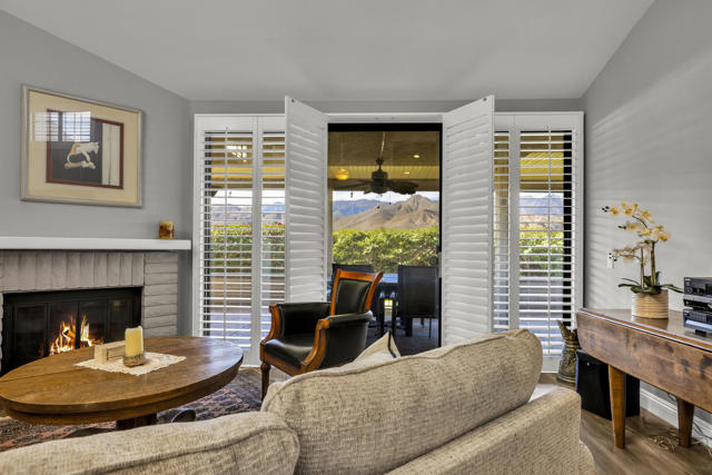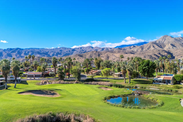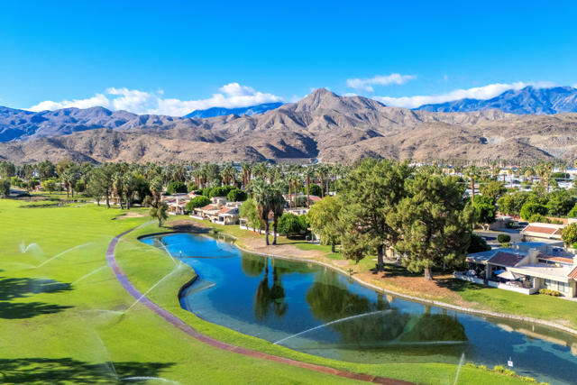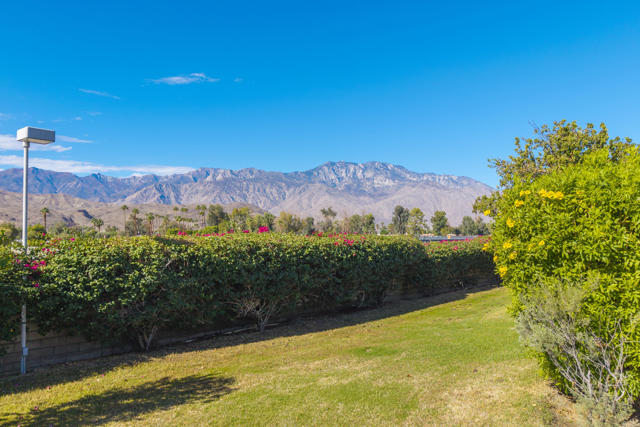 Back on Market--Buyers changed their minds. Welcome to this beautifully updated, turn-key furnished 3 bed, 2 bath unit located on one of the most desirable streets in Cathedral Canyon Country Club. Pride of ownership is obvious as you enter the double doors into the foyer. The recently remodeled kitchen opens onto the light and bright living room with volume ceilings, as well as a dining room just waiting to share cozy dinners. The kitchen also features a breakfast nook and a breakfast bar, perfect for everyday meals. High-end appliances, including a Wolf range, updated lighting, and granite counters make cooking in the chef's kitchen a joy. A gas fireplace in the living room is perfect for enjoying those chilly winter evenings as you watch the sun set over the magnificent San Jacinto mountains. Upgraded wood plank laminate flooring throughout lends an elegant feel while allowing for easy maintenance. Updated six-inch baseboards complete the contemporary look. The third bedroom is currently used as a separate den but could easily be turned back into a bedroom. The guest room features a private covered patio. The primary bedroom with lighted walk-in closet includes ensuite featuring a frameless shower and quartz counters. Sliders open from the primary bedroom, living room, and kitchen onto the south-facing covered patio. A custom mister system makes it the ideal place for morning coffee as you drink in your stunning mountain views. New HVAC system installed in 2024 cools the unit quickly and efficiently, even in the heat of summer. Your two-car garage with loft provides ample storage. HOA includes garbage, exterior and roof maintenance, cable, and internet. Cathedral Canyon Country Club offers golf, tennis, and clubhouse. With easy access to upscale dining, shopping, and Palm Springs airport, this home offers the best of desert resort living in a desirable gated community.