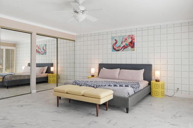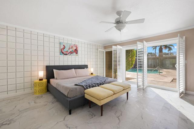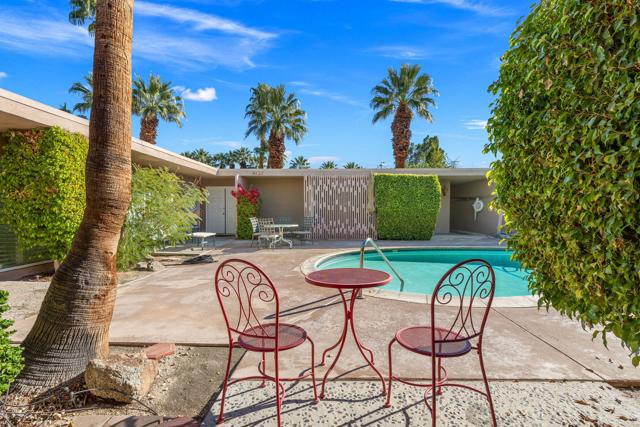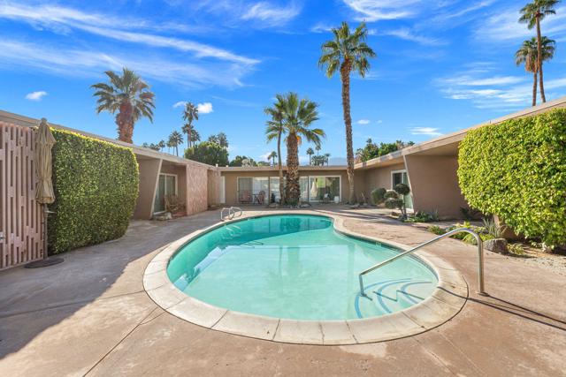 ADORABLE MID CENTURY BUNGALOW This two bedroom/two bath is the perfect desert home or getaway. Located on a cul-de-sac, all on one level, and walking distance to El Paseo for dining and shopping. Small private complex of just 4 units with shared pool. Great space, lots of light, view of the pool and mountains, plantation shutters thru out, double pane windows and LOW HOA fees. Lovely updated kitchen w/stainless appliances. Washer/dryer inside unit. Large primary bedroom w/large shower in primary bath. Updated guest bath. Inviting large front patio with Awesome mountain views. One car Garage w/storage. Join the Shadow Mountain Social Membership and meet your neighbors. Come take a look! You will not be disappointed!