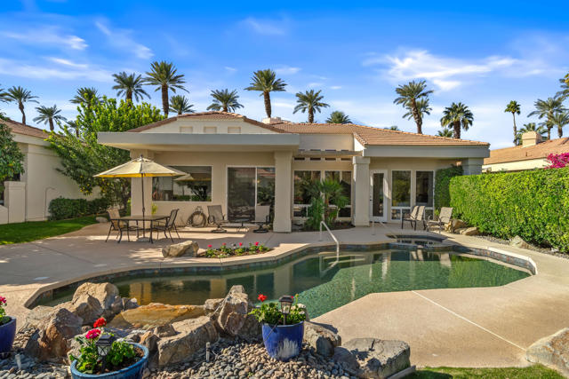 Tranquil and private setting overlooking the PebbleTec pool/spa, lagoon, waterfall as well as beautiful mountain views. Popular Spyglass floor plan offers 3 en-suites and and a powder room. Beautifully updated featuring hardwood flooring, white custom cabinetry and granite slab counter tops. This sought-after floor plan includes a formal living and dining room, separate family room, see through fireplace and eat-in kitchen. The high ceilings and abundance of windows a light & bright airy living space. Located in the heart of Indian Wells this home is desert living at it's best.
