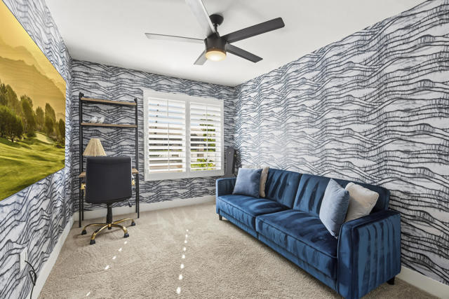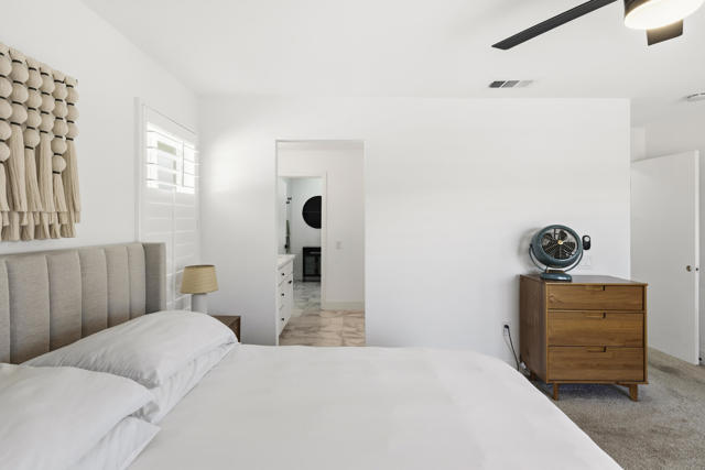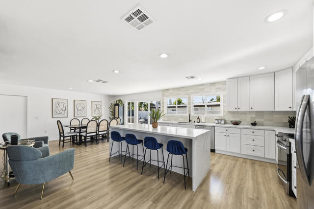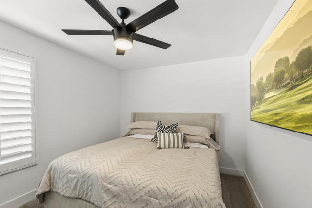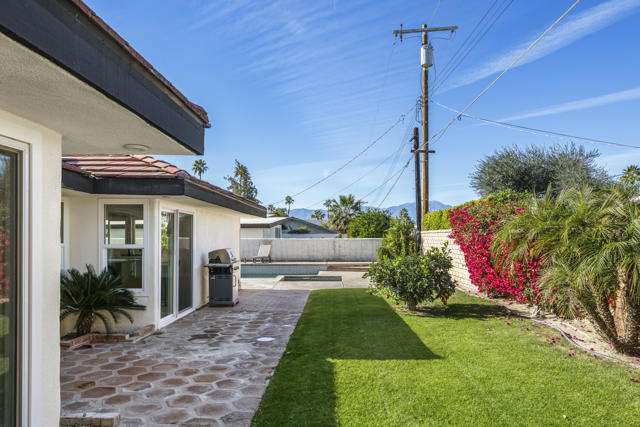 This beautifully remodeled single-story residence is located within the gated Bermuda Dunes Country Club and offers three bedrooms, two bathrooms, and an attached two-car garage. The bright and inviting living room features soaring ceilings, decorative accent beams, and a welcoming fireplace, creating an ideal setting for both everyday living and entertaining. Recent improvements are evident throughout, including durable laminate flooring and a fully updated kitchen with custom cabinetry, quartz countertops, a spacious center island, stainless steel appliances, a modern sink, and recessed lighting. Both bathrooms have been thoughtfully renovated with new flooring, updated vanities, refreshed showers, and contemporary fixtures. The expansive backyard captures scenic mountain views and provides generous space for outdoor gatherings, relaxation, and dining. A large swimming pool and spa highlight the exterior, complete with a new pump, filter, and recently completed tile work. Additional upgrades include a redesigned primary closet, a converted pantry, a new outdoor sprinkler control box, and fresh interior paint throughout. The low HOA fee includes 24-hour gated security, cable television, and high-speed internet. Optional club membership offers access to the clubhouse, fitness center, bocce ball courts, and 27 holes of championship-level golf.