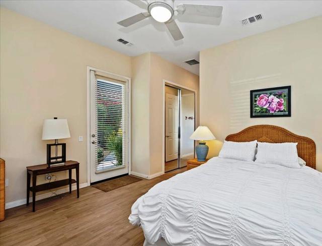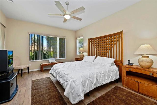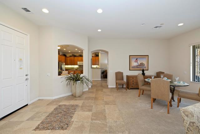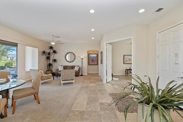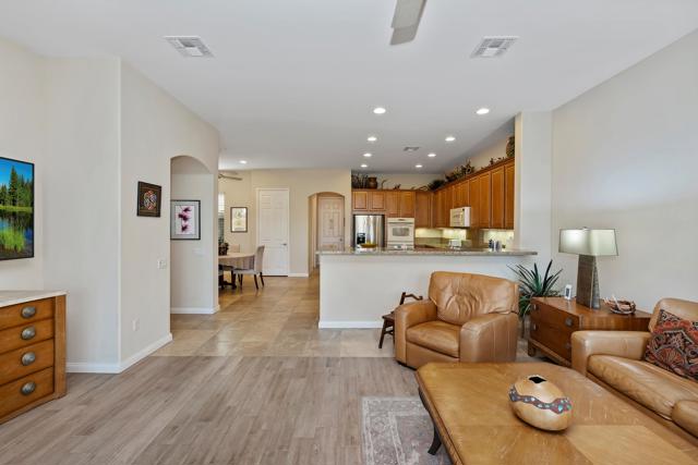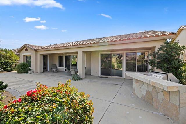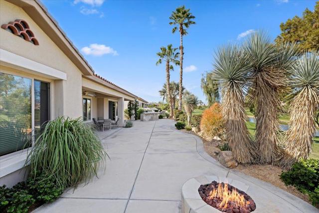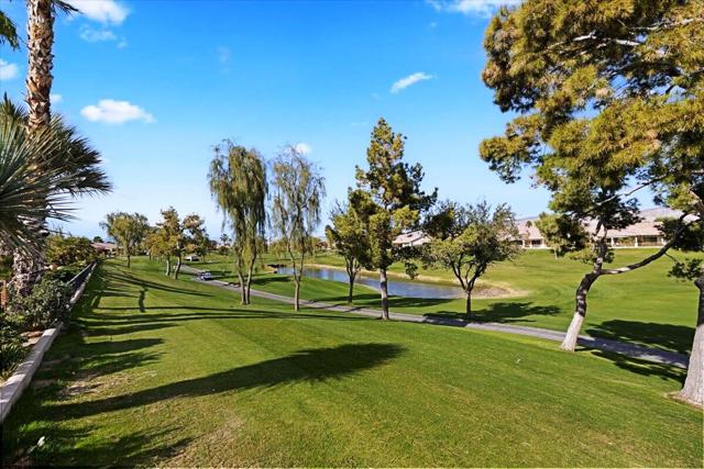 Exceptional golf course home with breathtaking golf, lake, AND mountain views. The elevated patio is a virtual haven for relaxing and enjoying the firepit and built in BBQ. Once inside this San Miguel model, you'll find the same magnificent views from the living room, kitchen, great room, and primary bedroom. The primary bath has a large dual vanity, separate soaking tub, shower and an incredible built in custom closet. The ensuite 2nd bedroom and bath have an outside courtyard entrance and could easily be separated from the main house by another interior door. Think...guests, extended family, a future caretaker, etc. The office is large enough to easily make a 3rd guest room. The garage has loads of built in storage. This home has been impeccably maintained by the original part time owners and is being sold with high end furnishings and artwork. Complete inventory list available . Close to the main Montecito Clubhouse. Sun City Shadow Hills is an over 55 community with 2 clubhouses, 3 pools, 2 golf courses, 2 fitness centers, pickleball, tennis, and over 50 clubs.NOTE: The 3rd bay of the garage is a golf cart bay.