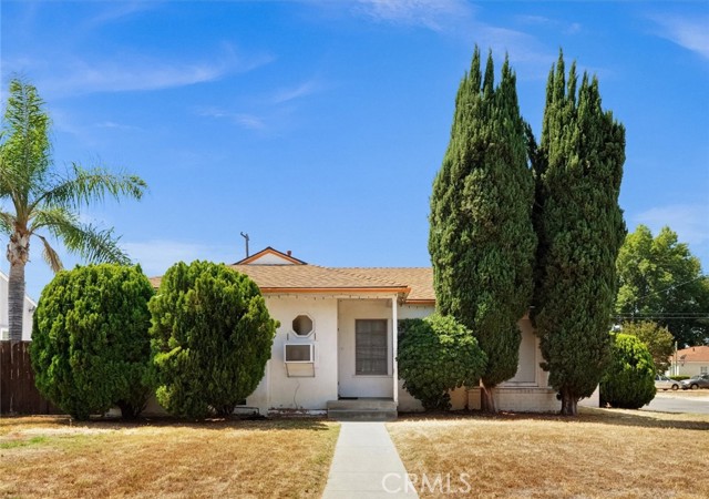 This mid-century 3-Bedroom home on a corner lot is on the market for the first in over 60 years. Located just around the corner from Merwin Elementary School, this 3-bedroom home offers a blend of original charm and a blank canvas for updating. Hardwood floors flow throughout the home, with ceiling fans in every bedroom to keep things comfortable. The bright living room welcomes you with abundant natural light and a ceiling fan, while the expansive galley kitchen boasts ample cabinetry, a ceiling fan, and vintage gold-and-maroon ceramic tile counters that add a touch of retro character. A cozy dining area attached to the kitchen features built-in cabinets, a floor-to-ceiling bay window and a hutch for extra storage. Off the kitchen, you'll find a service porch with a utility sink, newer water heater, and window A/C, plus an enclosed rear porch with parquet floors, laundry hookups, and sliding door access to the backyard. The full bathroom showcases original vintage gray-and-pink ceramic tile with a tub/shower combo and vinyl flooring. Outside, enjoy a spacious patio, grassy play area, and a small detached structure — ideal for storage or a potential ADU with a little imagination and creativity. The two-car detached garage offers plentiful storage cabinetry. Additional features include gravity heat and a window A/C unit at the front entry. Set in a quiet cul-de-sac location near daycare, churches, and local restaurants, this home offers convenience, character, and opportunity all in one package.