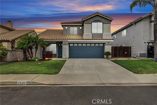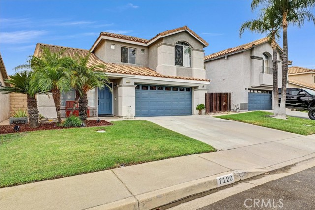 Welcome to 7120 Webb Court, a beautifully maintained two-story home tucked away on a quiet cul-de-sac in desirable North Fontana. This inviting 3-bedroom, 2.5-bath residence offers an open floor plan filled with natural light and numerous thoughtful upgrades throughout. The bathrooms have been tastefully remodeled, and the original 3-car tandem garage has been partially converted into a versatile downstairs bonus room, perfect for a home office, gym, or potential 4th bedroom with the right adjustment. Additional upgrades include a brand-new HVAC system, new laminate flooring upstairs, built in speakers, fresh interior and exterior paint, ceiling fans in every room, and updated electrical components with new plugs, switches, and added backyard outlets for lighting. The kitchen and dining area provide ample cabinet space and direct access to the private backyard, ideal for entertaining. Outside, enjoy manicured landscaping and two mature fruit trees (orange and lemon), creating a serene space for relaxation or gatherings. Upstairs, the primary suite features vaulted ceilings, dual sinks, and generous closet space. Conveniently located within the top-rated Etiwanda School District, this home is close to parks, shopping, dining, the 210 & 15 freeways, and the Pacific Electric Bike Trail — blending comfort, convenience, and lifestyle in one perfect package.