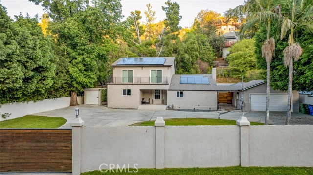 Welcome to this stunning four-bedroom, four-bathroom home, offering a perfect blend of elegance, comfort, and functionality. Step inside to a grand living room with soaring cathedral ceilings and a cozy fireplace, creating the ideal setting for both relaxing and entertaining. The inviting kitchen features a charming breakfast nook, while multiple living and dining areas flow seamlessly for everyday comfort. Upstairs, one of the bedrooms opens onto a private balcony overlooking the street, providing a perfect spot to unwind. Enjoy California living at its finest in the backyard retreat, complete with a sparkling pool, spacious patio, and a beautiful wooden deck — perfect for hosting gatherings or simply enjoying the outdoors. Additional highlights include a circular driveway, gated entrance for privacy, and ample parking space. The property is also equipped with a fully paid-off solar system, offering eco-friendly living and reduced utility costs. This home combines thoughtful design with timeless appeal, making it a true standout.