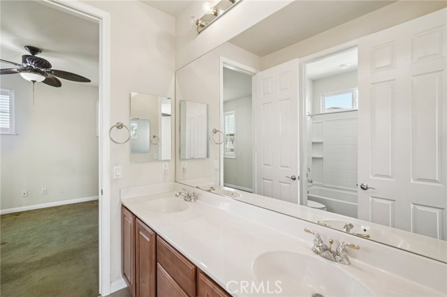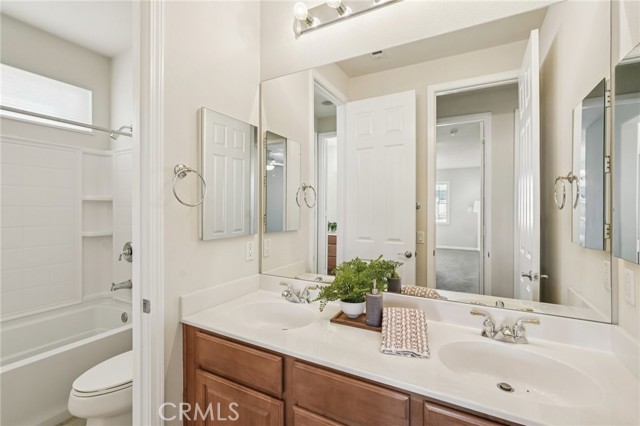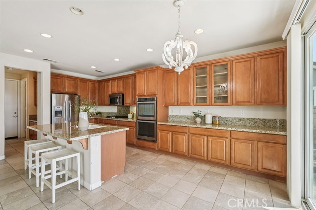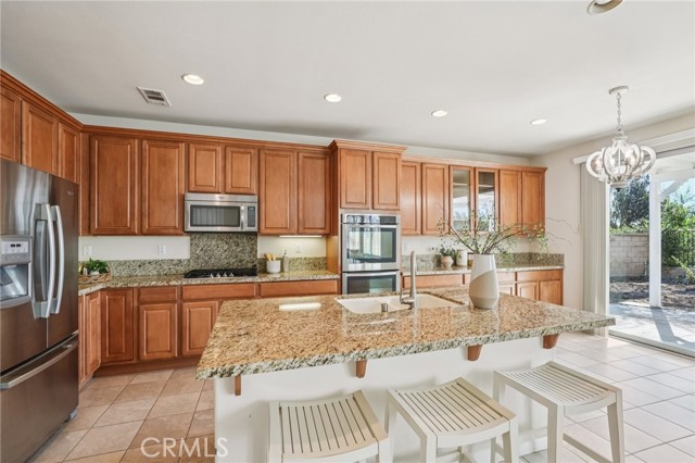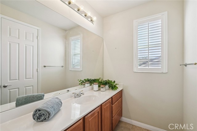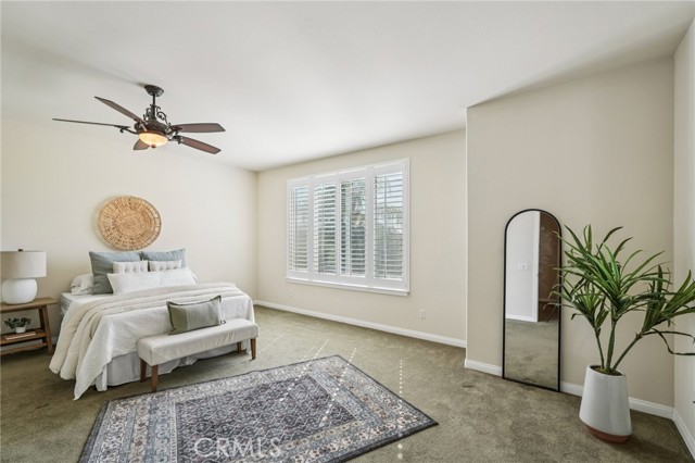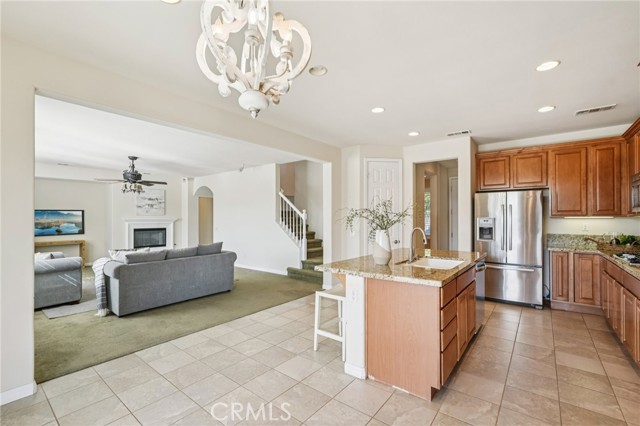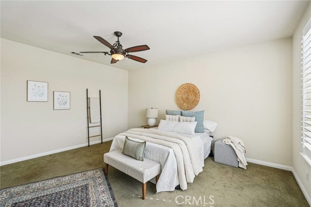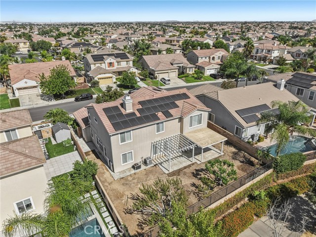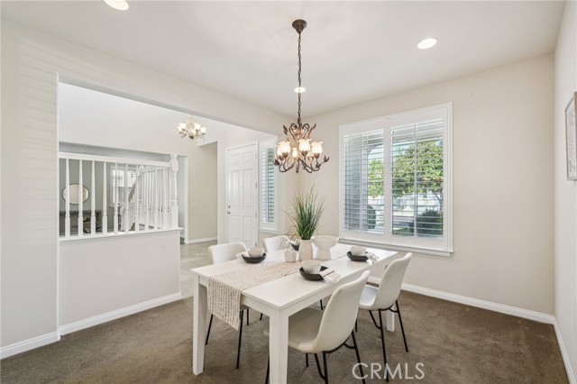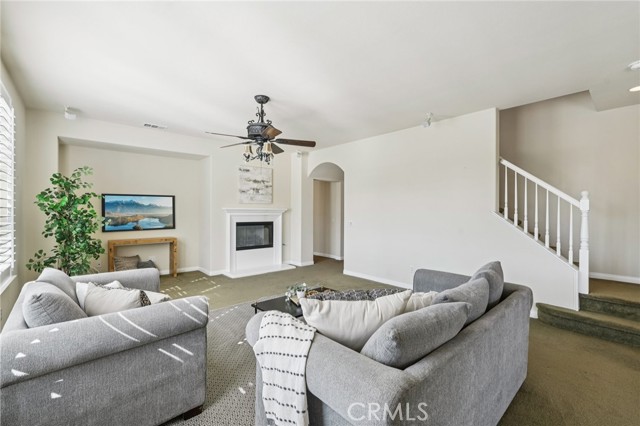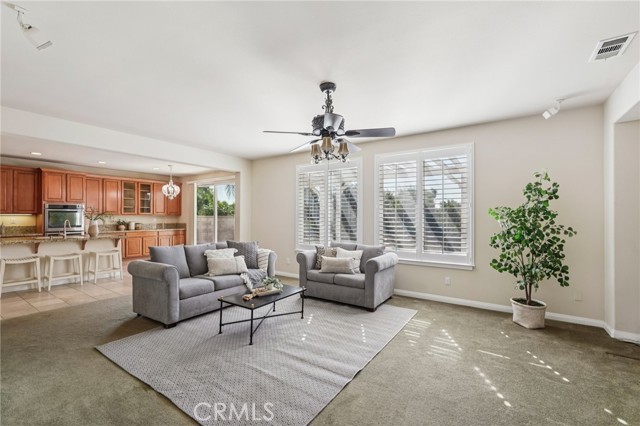 Unmatched Views & Energy Independence! This Eastvale home is a true standout, offering style, space, VIEWS, and modern efficiency with paid-off solar panels and two Tesla backup batteries — providing peace of mind, energy savings, and reliable power. From the moment you arrive, the curb appeal impresses with a lush green lawn and manicured landscaping. Inside, you're welcomed by a tiled entry and an open-railing staircase. To the left is a formal dining room that can double as a home office or playroom, and to the right, a formal living room. At the heart of the home is the expansive family room with a cozy fireplace and media niche, seamlessly connected to the open kitchen. The chef's kitchen offers abundant cabinetry, granite countertops, a built-in cooktop, double oven, large center island, and breakfast nook. Sliding glass doors lead to the backyard for effortless indoor-outdoor living. The main floor also includes a bedroom and full bathroom, and a laundry room with a sink and cabinetry. Upstairs, the primary suite captures sweeping views of the Santa Ana River and surrounding greenbelt. The spa-inspired bathroom includes dual sinks, a soaking tub, walk-in shower, and a spacious walk-in closet. Four additional bedrooms and two more bathrooms provide plenty of room for family and guests. Plantation shutters throughout add a touch of elegance. The backyard is designed for both relaxation and entertaining, with a covered patio, stamped concrete, a large grassy area, and breathtaking greenbelt views that make every day feel serene. With its unobstructed views, fully paid-off solar system, and two Tesla Powerwall batteries, this home combines natural beauty with energy-smart living — a rare find that delivers comfort, savings, and sustainability.