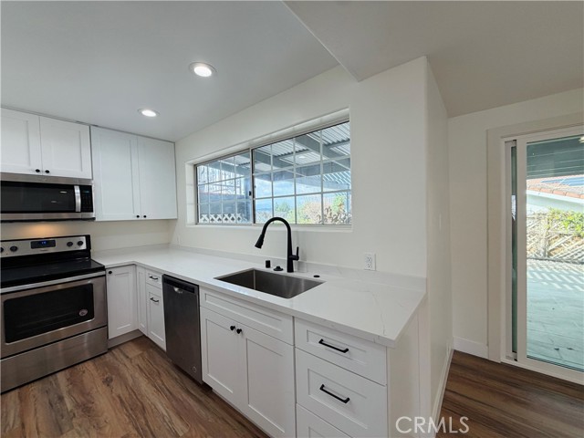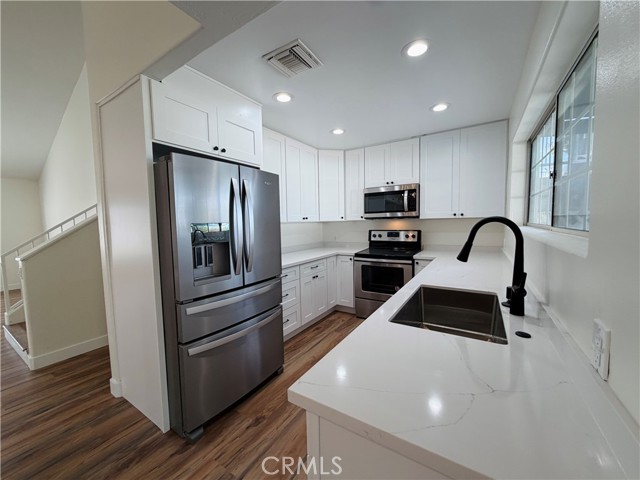 Completely Remodeled Corner Lot Home with Main Lake View from the upstairs deck and 2nd bedroom. Open floorplan with living room, family room with fireplace, and dining room all with vaulted ceilings. Brand new kitchen with white soft close cabinetry and solid countertops, and stainless steel appliances. Huge Primary Suite on main level with vaulted ceilings new slider leading to the backyard, walk-in closet + an additional closet and brand new bath with a very large walk-in custom tiled shower and free standing tub, and dual sink vanity. 2 Bedrooms upstairs, 1 is extra large with a walk-in closet and a new slider to it's own Juliet Balcony. The 2nd bedroom features lake views, vaulted ceilings with a new slider to the large balcony. Brand new bath with custom tiled walk-in shower and large vanity plus linen closet. Separate indoor laundry room and storage room that could be used as a walk-in vanity or small office. The backyard offers a covered trellis, brand new landscaping including artificial turf, rocks, and bark plus pomegranate trees and lots of trees & shrubbery. 2 car garage with storage and brand new garage doors. Tons of upgrades including; new flooring, new kitchen, new baths, new faucets, fixtures, hardware, garage doors, lighting, and landscaping! An Absolute Gem!