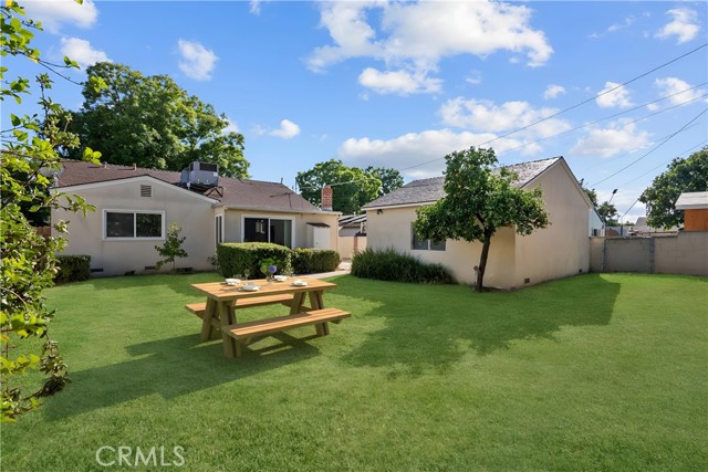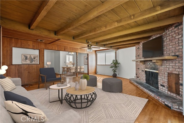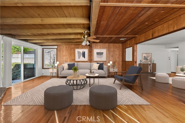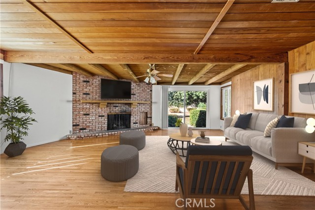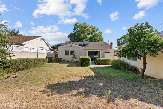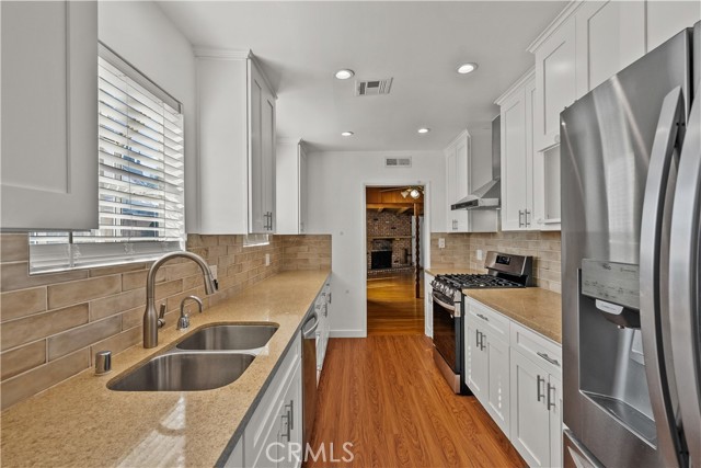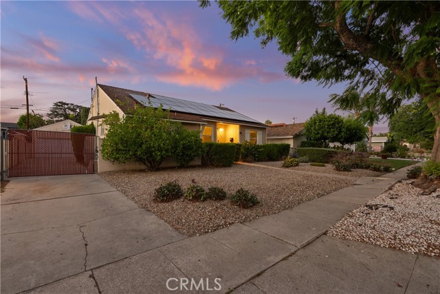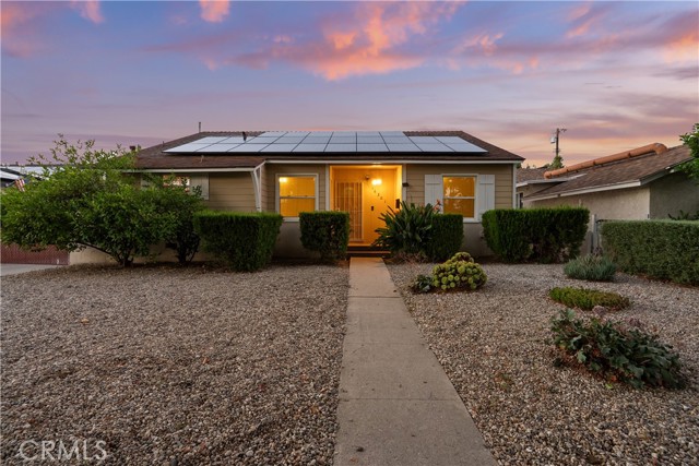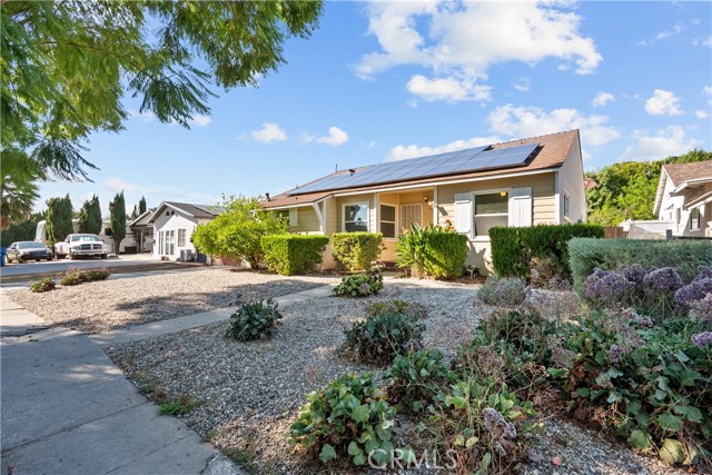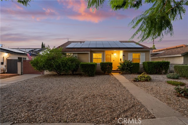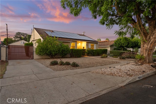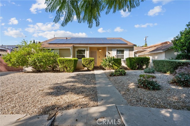 Tucked away on a quiet, tree-lined street in the sought-after Granada Hills neighborhood, this delightful mid-century home offers the perfect combination of vintage character and modern upgrades. Surrounded by a friendly, well-kept community, this home is ideal for comfortable family living. A welcoming front porch leads into a warm and inviting interior featuring hardwood floors, abundant natural light, and timeless architectural details throughout. With three bedrooms and two bathrooms, this home provides generous space for both relaxing and entertaining. The heart of the home is the remodeled cook's kitchen, showcasing recessed lighting, crisp white shaker cabinets, quartz countertops, and a classic subway tile backsplash. Quality appliances include a gas range with vent hood, dishwasher, and refrigerator. Just off the kitchen is a functional laundry room with storage and access to the side yard. The cozy living room connects seamlessly to a dedicated dining area, accented by hardwood flooring and a ceiling fan light fixture — perfect for daily meals or festive gatherings. A spacious family room features wood-beamed ceilings, a brick fireplace, and sliding doors that lead to a private backyard, blending indoor comfort with outdoor living. The spacious primary bedroom offers hardwood floors, dual closets, and an en-suite bathroom with a tiled stall shower and separate vanity. Two additional bedrooms are bright and well-sized, each with ceiling fans, hardwood floors, and ample closet space. A full hallway bathroom with a tiled shower-over-tub and a vanity serves these rooms. Step outside to the private backyard with a sprawling lawn and mature greenery — an ideal space for entertaining, play, or peaceful retreat. The extended concrete driveway and detached two-car garage offer abundant parking and storage. Thoughtful upgrades include central air and heat, dual-pane windows, mostly copper plumbing, and an owned energy-efficient solar system for lasting savings. The large backyard with detached garage provides excellent potential for a freestanding Accessory Dwelling Unit (ADU). Conveniently located near schools, shopping, dining, and freeway access, this move-in ready gem combines classic style with today's comforts — ready for you to call home.