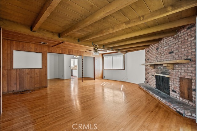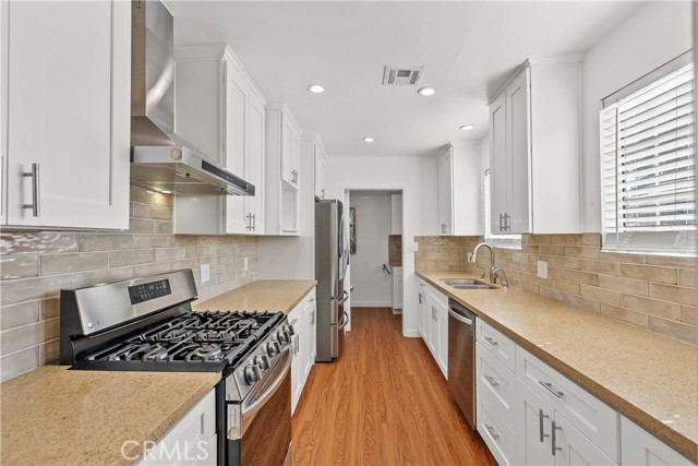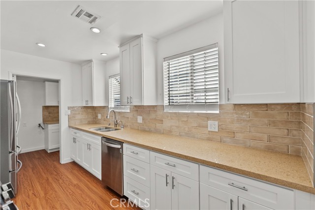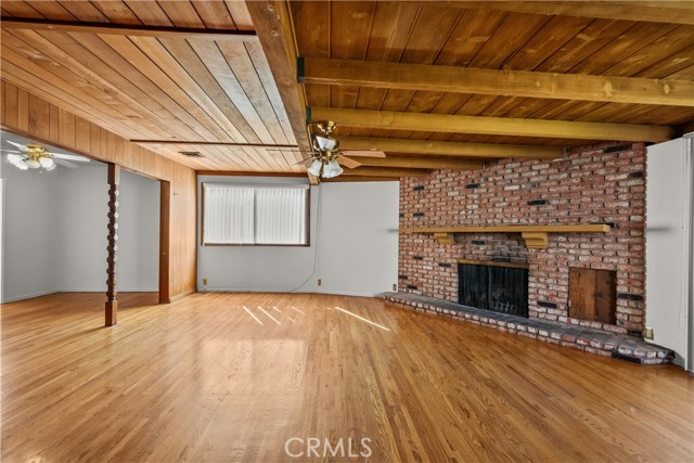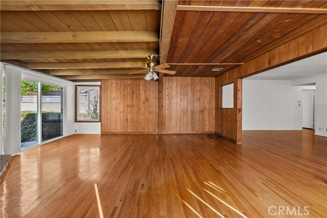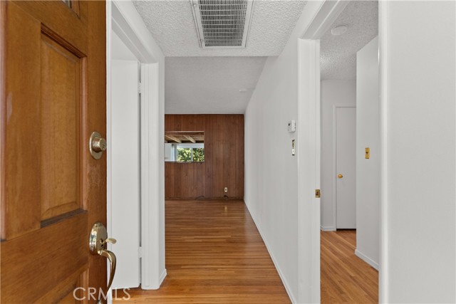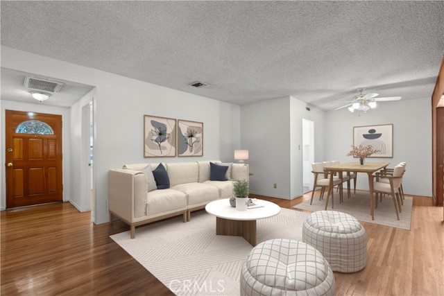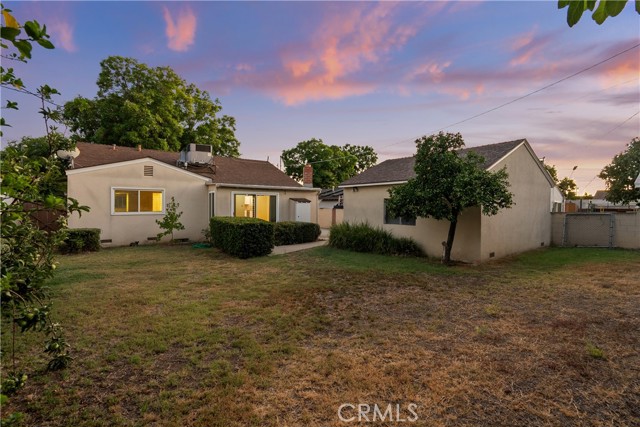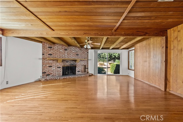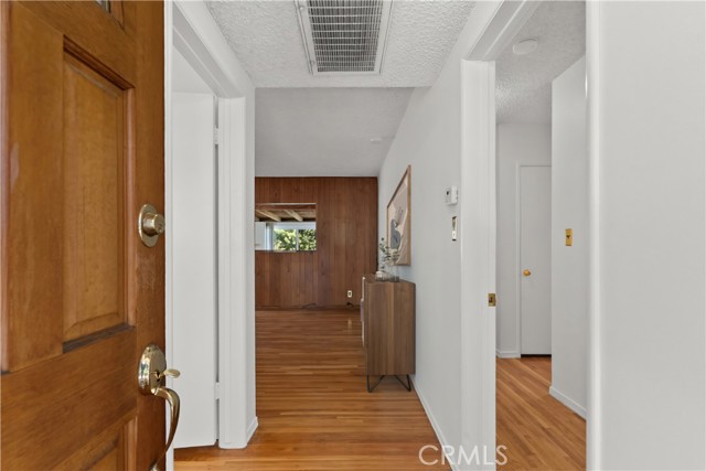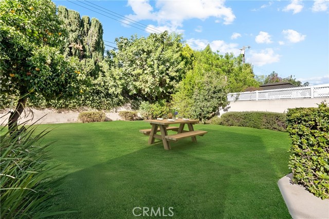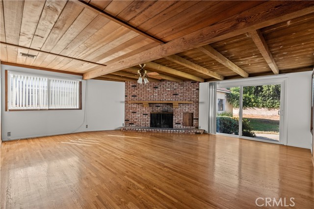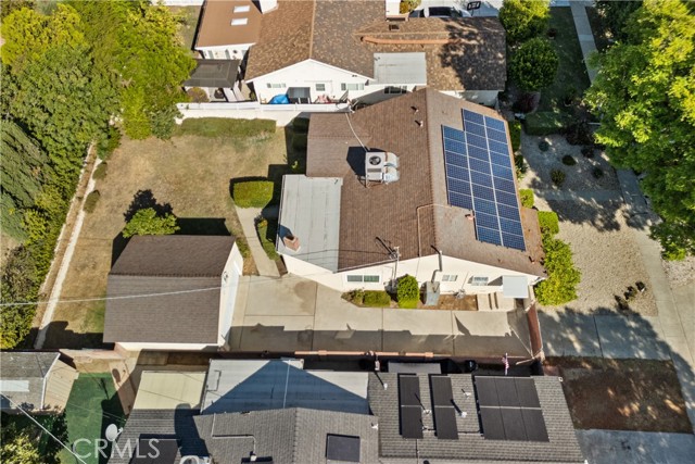 Tucked away on a quiet, tree-lined street in the sought-after Granada Hills neighborhood, this delightful mid-century home offers the perfect combination of vintage character and modern upgrades. Surrounded by a friendly, well-kept community, this home is ideal for comfortable family living. A welcoming front porch leads into a warm and inviting interior featuring hardwood floors, abundant natural light, and timeless architectural details throughout. With three bedrooms and two bathrooms, this home provides generous space for both relaxing and entertaining. The heart of the home is the remodeled cook's kitchen, showcasing recessed lighting, crisp white shaker cabinets, quartz countertops, and a classic subway tile backsplash. Quality appliances include a gas range with vent hood, dishwasher, and refrigerator. Just off the kitchen is a functional laundry room with storage and access to the side yard. The cozy living room connects seamlessly to a dedicated dining area, accented by hardwood flooring and a ceiling fan light fixture — perfect for daily meals or festive gatherings. A spacious family room features wood-beamed ceilings, a brick fireplace, and sliding doors that lead to a private backyard, blending indoor comfort with outdoor living. The spacious primary bedroom offers hardwood floors, dual closets, and an en-suite bathroom with a tiled stall shower and separate vanity. Two additional bedrooms are bright and well-sized, each with ceiling fans, hardwood floors, and ample closet space. A full hallway bathroom with a tiled shower-over-tub and a vanity serves these rooms. Step outside to the private backyard with a sprawling lawn and mature greenery — an ideal space for entertaining, play, or peaceful retreat. The extended concrete driveway and detached two-car garage offer abundant parking and storage. Thoughtful upgrades include central air and heat, dual-pane windows, mostly copper plumbing, and an owned energy-efficient solar system for lasting savings. The large backyard with detached garage provides excellent potential for a freestanding Accessory Dwelling Unit (ADU). Conveniently located near schools, shopping, dining, and freeway access, this move-in ready gem combines classic style with today's comforts — ready for you to call home.