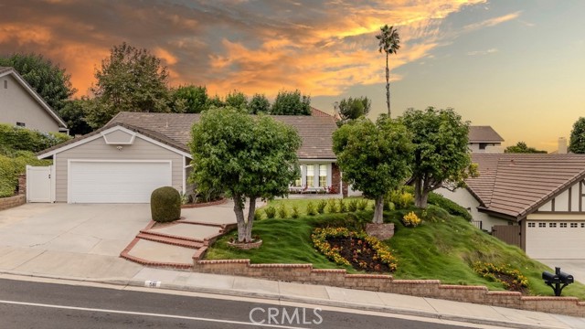 Single-story 3-bedroom 2-bath view home at 581 S Paseo Carmel in Anaheim Hills offers city lights and mountain vistas along with a spacious primary suite and a backyard retreat built for entertaining. The property begins with great curb appeal, wood siding with brick accents, and a landscaped approach. A covered entry functions as a front patio seating area and sets a welcoming tone. Inside, wood-look tile flooring runs throughout with no interior steps. The main living area opens under vaulted wood beam ceilings with abundant natural light, creating a bright and open feel that blends into the dining area. A hallway with a double-door storage closet leads toward the family room, where vaulted ceilings continue above a tall whitewashed brick fireplace wall. The family room flows into a kitchen nook finished with wainscoting and wood accents, positioned beside large windows for natural light. The kitchen is anchored by a peninsula counter and finished with granite countertops, a herringbone marble mosaic backsplash, recessed lighting, and a deep sink. A garden bay window offers extra display space. Appliances include a gas cooktop, oven, dishwasher, and trash compactor. Pull-out drawers add convenience, and the adjacent dining space accommodates a full table. The primary suite features double door entry, vaulted ceilings with a ceiling fan, dual mirrored wardrobes, and French doors with operable side windows. Its en suite bath offers dual granite vanities, a walk-in shower with seating bench, a private water closet, and large travertine tile finishes. The second bedroom, also with double-door entry, is used as an office with ceiling fan and mirrored closet, while the third bedroom includes the same. The guest bath is a full bath with granite vanity and large travertine tile shower surround. The laundry room is inside with overhead cabinetry. The attached two-car garage provides direct access, storage cabinets, and overhead racks. The backyard is designed as an entertainer's retreat, featuring a large Luminwood patio cover with recessed lighting and dual ceiling fans, paver hardscape, built-in barbecue with bar seating, a decorative glass gas fireplace, turf, and a putting green. Mature trees along the rear add privacy while framing the city lights and mountain views. Located minutes from shopping, dining, and parks with nearby access to freeways and award-winning schools, this property offers a single-level lifestyle with outdoor amenities and relaxing views.
