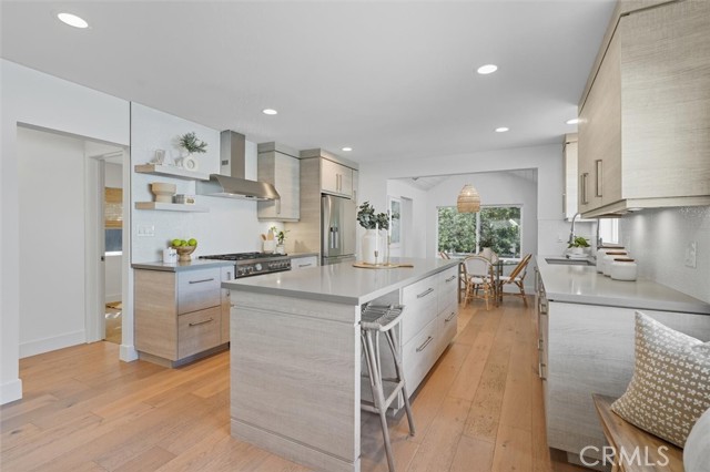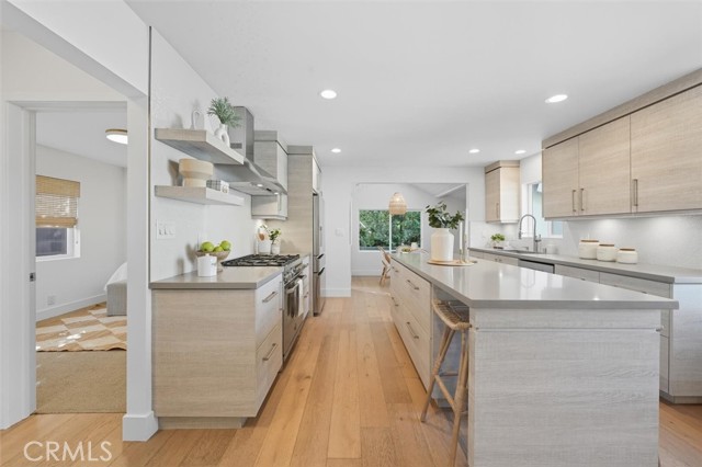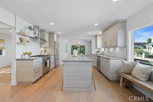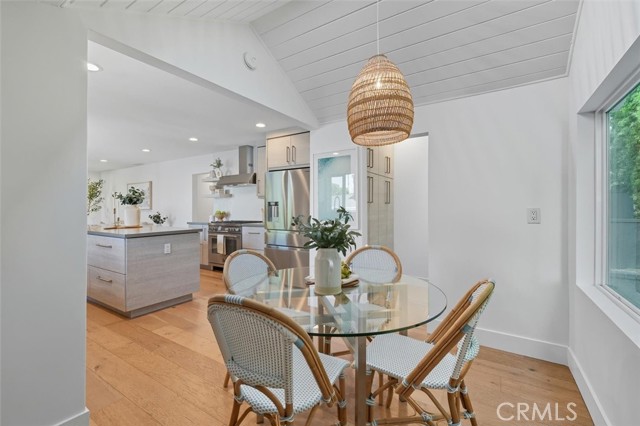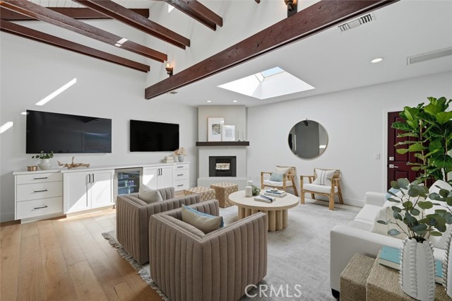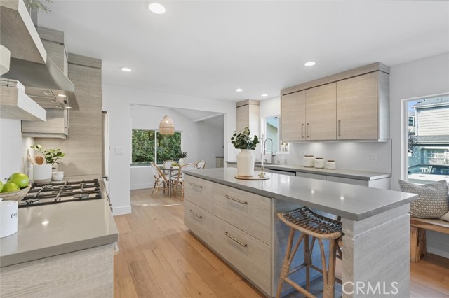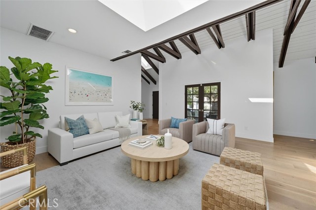Single-level living in Manhattan Beach's coveted Tree Section shines in this sun-filled home with soaring beamed ceilings and skylights that fill the interior with natural light. The open floor plan feels both welcoming and sophisticated, offering a seamless flow ideal for today's lifestyle. The sleek, modern kitchen looks brand new and was designed with entertaining in mind. It features a spacious island, breakfast nook, and built-in wine fridge. Double doors open seamlessly to the front deck, where a gorgeous tree creates a serene backdrop for morning coffee or sunset gatherings. This true indoor-outdoor flow makes the home an entertainer's dream. The expansive family room offers the perfect setting for holidays, movie nights, or hosting friends, while the private bedrooms provide peaceful retreats. An oversized garage delivers ample storage for beach gear, bikes, and more, while new central AC ensures year-round comfort. Located just minutes from the sand, top-rated Grand View Elementary, downtown Manhattan Beach, shopping, dining, and quick freeway access, this home offers the ultimate in effortless South Bay living — Welcome Home!!
