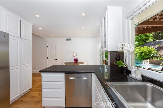 This 4 bedroom 2 bath West Hills home has been remodeled and updated with a fine attention to detail. White Oak engineered flooring and plantation shutters grace the light and bright interior. Don't miss the inset light switches, wall sockets and trim-less recessed lights. So nicely done! New 220 amp electrical panel to handle all your modern living needs, new 17 seer HVAC and UV filtration, smart lighting, custom marble fireplace surround, 5.1 audio for video in the living room, they have thought of everything. A beautiful mahogany front door greets you and the interior doors are contemporary 3 panel and solid core. Ring doorbell and cameras are hard-wired so you can keep an eye on things. The front yard is turfed and drip irrigated for environmental considerations. There is direct access from the epoxy floored garage. Nearby you will find top public and private schools. Pool and spa need updating.