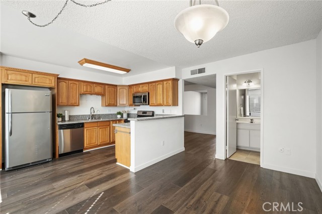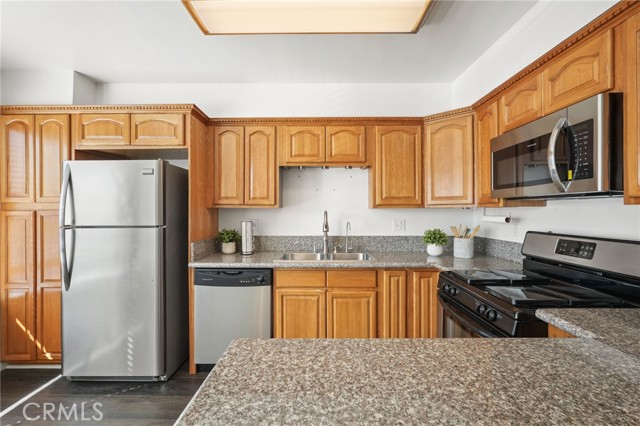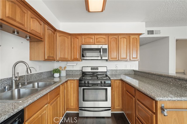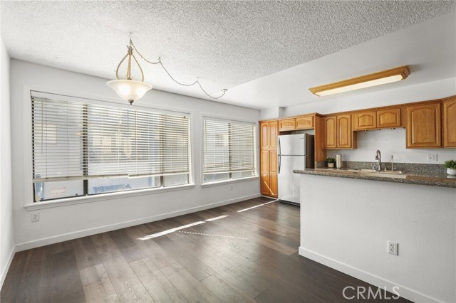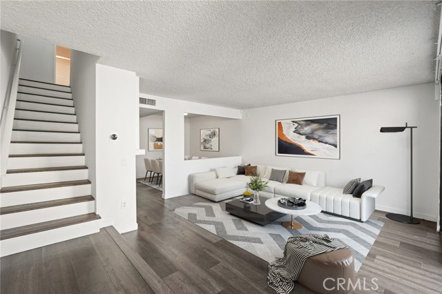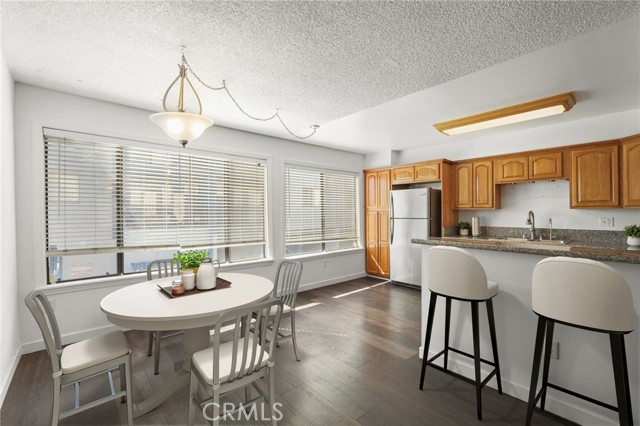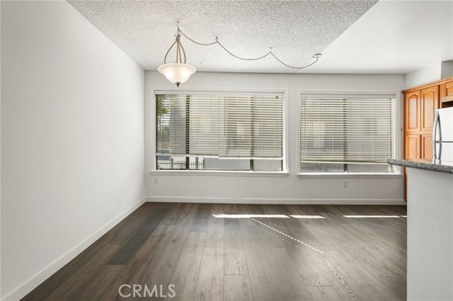 Welcome to this spacious two-story condo in the heart of Woodland Hills. With a practical layout and new vinyl flooring throughout, this home offers comfort, functionality, and room to make it your own. The main level features two separate dining areas, a generously sized kitchen with ample counter space and modern appliances, and a cozy living room with a fireplace — perfect for relaxing evenings at home. Just off the living area, sliding glass doors open to a private enclosed patio, ideal for enjoying your morning coffee, entertaining guests, or getting some fresh air. Upstairs, you'll find two well-sized bedrooms, each with its own walk-in closet. One bedroom includes an ensuite bathroom, offering privacy and convenience. The laundry area is tucked into a hallway closet with hookups for a side-by-side washer and dryer. Additional highlights include central air and heat, and two assigned parking spots in a gated garage. The community features a pool, spa, and landscaped courtyards, all within a secure and well-maintained complex. Conveniently located near Warner Center, Westfield Topanga, The Village, restaurants, cafes, and with easy access to the 101 and 118 freeways — this condo offers space, comfort, and a great Woodland Hills location.