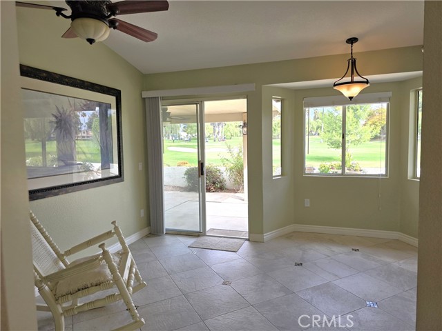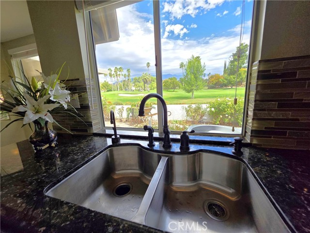 Mountain and golf course views unmatched in Sun Lakes!!! Highly Upgraded Sunningdale with a Golf Course Green View Location. This is one of the most beautiful view lots in all of Sun Lakes. Home is at the end of a road with little to no street traffic. Features a beautiful unobstructed panoramic view of the San Gorgonio Mountains with a big double fairway view of the 16th and 17th holes. The Home is located adjacent to the 16th green and as a result the patio can be safely enjoyed with no fear of errant shots. Patio has a newer Alumiwood cover with beautiful landscaping and decorations. Inside find a tastefully renovated Sunningdale Model 2 bedroom 2 bathroom plus den with atrium/patio. This home has upgraded newer paint, upgraded moldings, custom tile with accents in all the traffic areas, Kitchen has been renovated with new appliances, granite countertops, sink and high end fixtures. 2 CAR Plus golf cart Epoxy floor garage with pull down attic storage, and wall storage cabinets. All maintenance has been recently performed. This is an absolute gem of a home located on the perfect lot.
