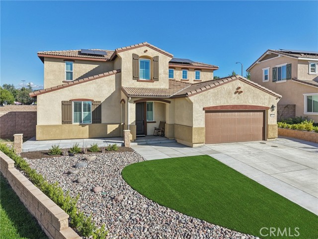 Craving a home with designer finishes and future-ready upgrades? Set on a beautifully manicured lot, this 4-bedroom, 3-bath Yucaipa residence shines like new with bright windows, stylish shutters, and an inviting open-concept layout! Inside, recessed lighting highlights the bespoke cabinetry, custom countertops, and stainless steel appliances in the contemporary kitchen, complete with a central island and pantry for added functionality. A guest room on the main level offers convenience, while the generous primary retreat upstairs features dual walk-in closets and a serene ensuite. A flexible office adapts with ease for remote work or to a fifth bedroom. The laundry area with sink and attached 2-car garage adds everyday comfort. Outside, a low-maintenance yard surrounds the wide patio, already prepped for your dream outdoor kitchen, pool, or spa. Enjoy the perks of a concrete retaining wall, solar panels, water softener system, and a $15,000 forgivable grant. With proximity to Yucaipa Regional Park, local shops, and the I-10 Fwy, come see how this tranquil haven could be part of your next chapter!