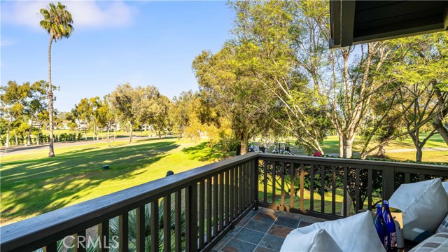 On a premium corner lot at the end of a quiet cul-de-sac, this beautifully remodeled home offers panoramic views of the golf course, ponds, city skyline, and sunsets, including a direct overlook of the 13th-hole tee-box. Step through the front gate into a tranquil, private courtyard with warm lighting, featuring a custom heated spa, a rock waterfall, and a bar-height counter overlooking lush greenery — ideal for entertaining or unwinding. Inside, the open floor plan boasts cathedral ceilings, dual-pane windows, and abundant natural light. The living room opens to the dining area, while the remodeled gourmet kitchen — with top-of-the-line stainless steel appliances, granite counters, custom cabinetry and recessed lighting — flows seamlessly into the dining area. Sliding glass doors in both the dining room and kitchen lead to a wrap-around deck extending around the back and side of the home, perfect for indoor-outdoor living. The primary bedroom features a sliding glass door to the back patio with golf course views. It includes a spacious ensuite bathroom with a vanity area, a separate shower room, and a privacy door to the toilet, along with a cozy sitting area and mirrored closets. All bedrooms and bathrooms have recessed lighting, and each bathroom has been beautifully remodeled. Additional highlights include custom cabinetry around the stairs, a remodeled fireplace, and finished storage areas. Recent upgrades feature a new 50-year roof and tenting completed in Summer 2023, with the HOA special assessment fully paid. Conveniences include a direct-access two-car garage and an indoor laundry area. Residents enjoy access to two community pools and spas, with association dues covering water, trash, and exterior maintenance. Ideally located in the esteemed Irvine School District, including University High, and just minutes from UCI, William Mason Park, John Wayne Airport, Newport Beach, and Fashion Island. This home offers refined, move-in-ready living with spectacular golf course views and timeless appeal.