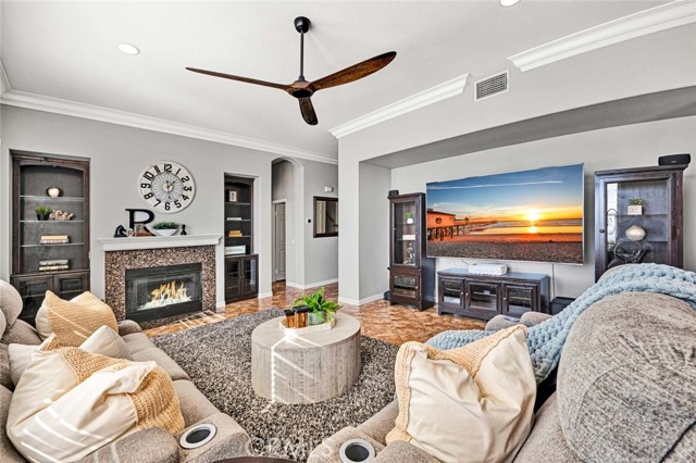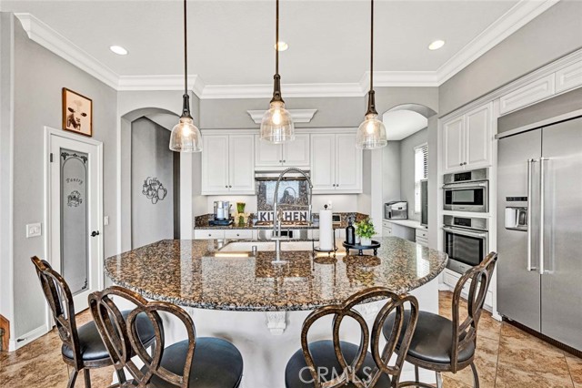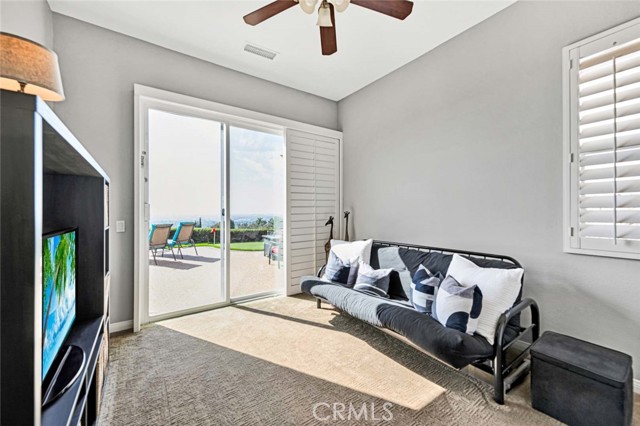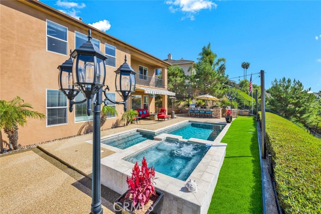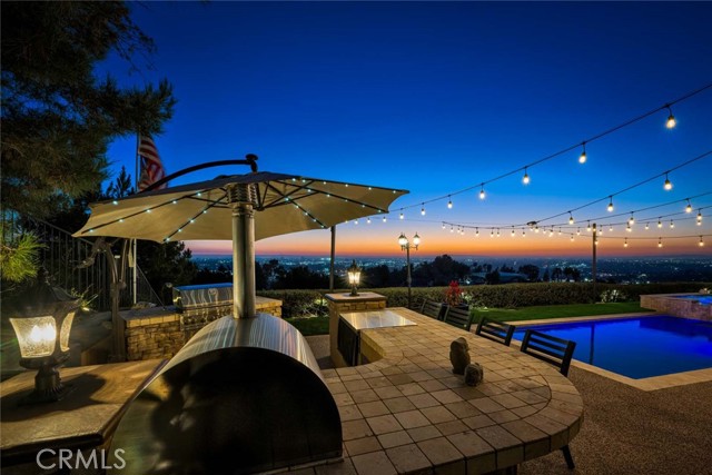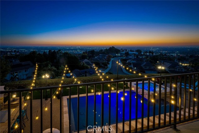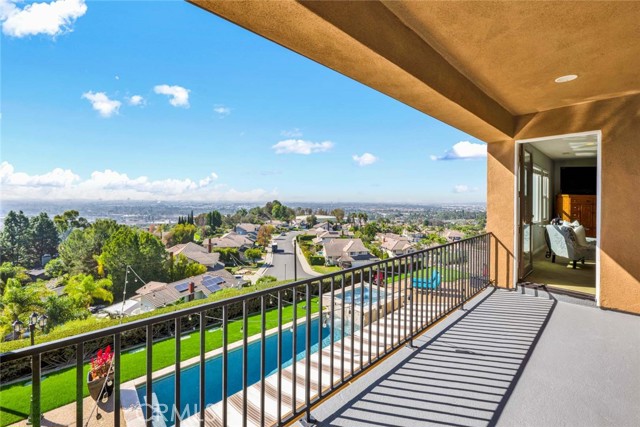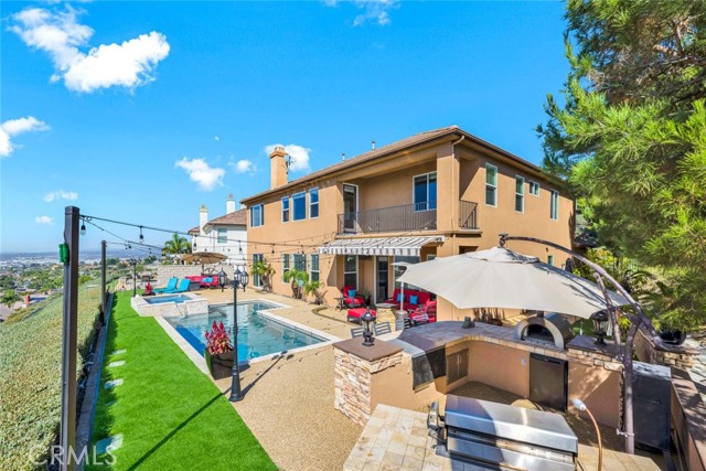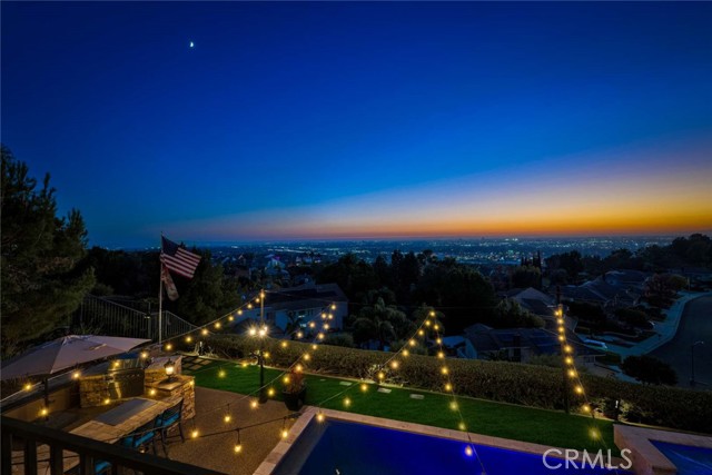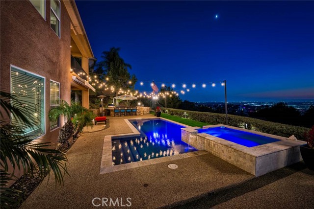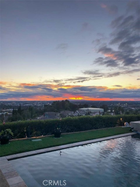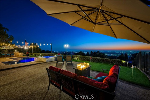 Imagine standing on a hill in Orange County with the entire OC basin laid out at your feet.By day you can see all of the landmarks-Disneyland,the Honda Center, Angels Stadium and more, and on a clear day, you can see Catalina Island and all the way to LA. The show starts when the sun sets and you're treated to magnificent works of art on the horizon.After sunset, the city lights start to shine and sparkle like jewels in a treasure chest. Now imagine this hill is in your own backyard! You enjoy this breathtaking view from the pool and spa, from the outdoor kitchen with barbecue, hibachi grill, pizza oven, refrigerator and bar seating for your friends & family.There are outdoor living areas under the awning and on the corner patio and there's even a putting green, all with a breathtaking view! Your private paradise also includes a magnificent,sprawling 4,345 square foot home! You traverse the hill and arrive at a gated enclave of incredible homes. When arriving at the home, you notice the meticulously manicured landscaping leading to a secluded porch and custom leaded glass double entry doors and a lovely fountain.They open to an elegant foyer with soaring 2 story ceilings and a gorgeous chandelier.To the right is the formal living room with elegant fireplace and the adjacent home office accessed through double doors from the living room or a separate entry door off the front porch.To the left is a formal dining room with ample space for large gatherings.A butler's pantry leads to a gourmet kitchen and breakfast room, both creating a great room with the family room with fireplace.Beyond the family room is an ensuite bedroom with private bath and access to the back and side yards.Rounding out the first floor is a powder room,walk-in pantry & laundry room.Upstairs,the staircase splits with the right side leading to the elegant owner's suite that takes in the magnificent view from indoors or a large balcony.There are 2 huge walk-in closets,an opulent spa style bath with jetted tub and separate shower & an exercise niche.Up the left staircase,there's a bonus room with limitless uses and access to the front balcony.The spacious secondary bedrooms all have big closets and consist of an ensuite bedroom with private bath and a pair of Jack 'n Jill bedrooms that share a bath.There are far too many wonderful things to say and list about this fabulous home.You really need to see it and experience it.Once you do that, you'll never want to leave! Come make it yours!