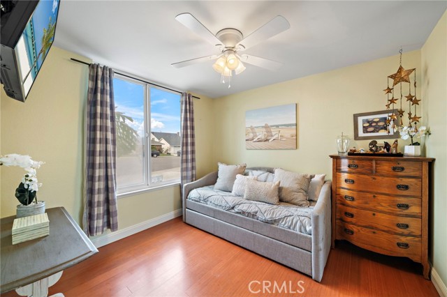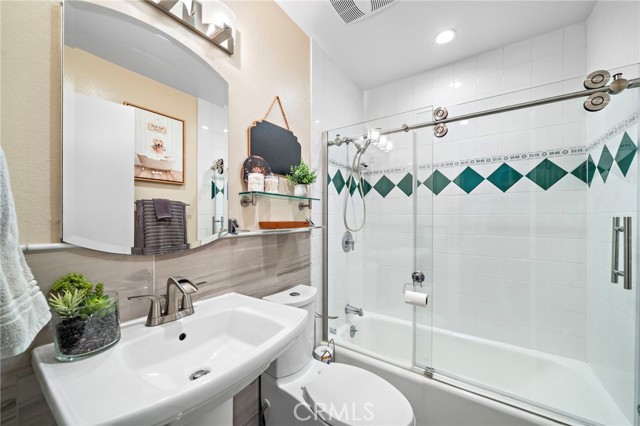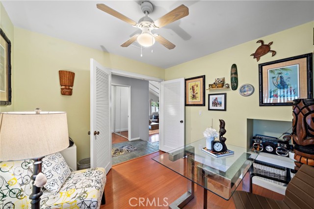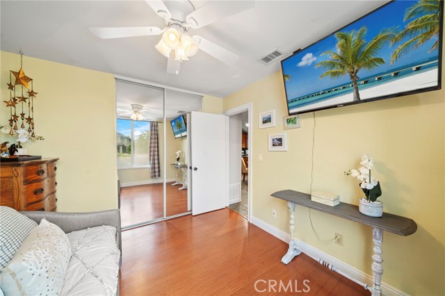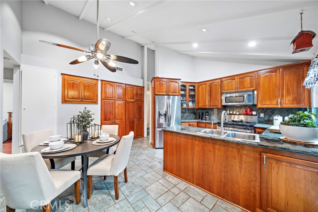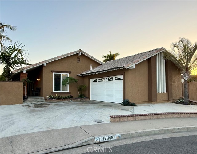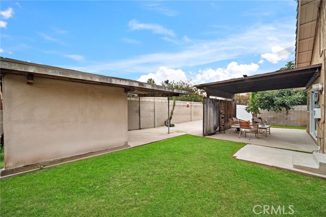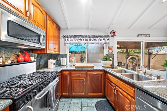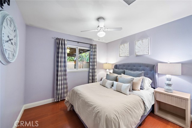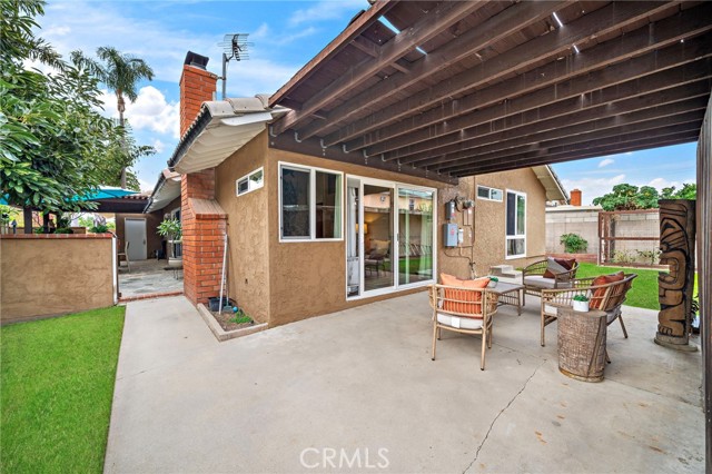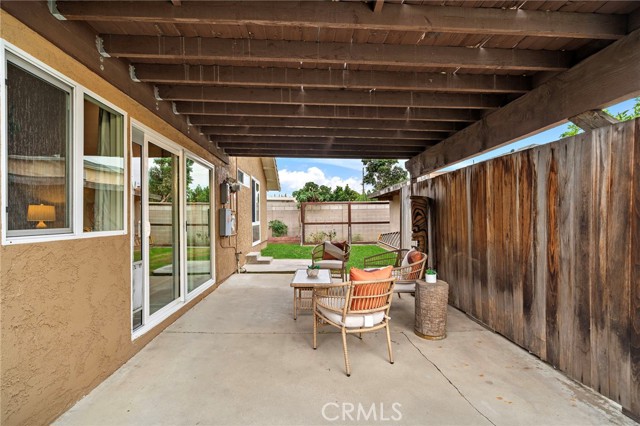 Paid off solar! - Welcome to this stunning single-story home nestled on a peaceful cul-de-sac in the highly sought-after Green Valley community. From the moment you arrive, you'll be impressed by the beautiful curb appeal, featuring an oversized curved driveway for 3 cars, designer exterior paint, and a charming covered front porch. Inside, this thoughtfully designed home offers 4 spacious bedrooms and 2 upgraded bathrooms. The living room features vaulted, beamed ceilings and an abundance of natural light streaming through a large sliding door, creating a bright and inviting atmosphere. Elegant designer tile flooring flows through the main living areas, complemented by bamboo laminate floors in the bedrooms, recessed lighting, and a cozy brick fireplace as the perfect focal point. The chef's kitchen is a true highlight, showcasing solid cherry cabinetry, granite countertops, a 6-burner gas range, and a breakfast bar that opens to a casual dining area — ideal for both entertaining and everyday living. The primary suite offers a peaceful retreat with a ceiling fan, abundant natural light, and a beautifully updated ensuite bath featuring a floor to ceiling tiled walk-in shower. Three additional bedrooms are generously sized, with ceiling fans, mirrored wardrobes, one with a French door entry. The remodeled guest bath includes a stylish pedestal sink and a tub/shower combo. Step outside to your private backyard oasis, complete with two covered patios, paver pathways, a lush grassy area, a storage shed, a fenced garden, and gated RV parking from Los Jardines E. Residents of Green Valley enjoy low HOA dues and access to three community pools, clubhouses, playgrounds, and more. Conveniently located near Mile Square Park, shopping, dining, entertainment, and major freeways, this home offers the perfect blend of comfort, style, and convenience.