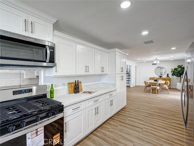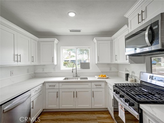 Beautifully remodeled 3-bedroom, 2-bathroom residence located on a quiet cul-de-sac. This home features an open and inviting layout with new laminate flooring throughout. The remodeled kitchen offers new cabinets, quartz countertops, and new stainless steel appliances. Both bathrooms have been tastefully updated. The bedrooms include new mirrored closet doors and recessed lighting throughout home. It also includes an atrium that provides extra lighting. Enjoy a spacious backyard with lots of fruit trees-ideal for entertaining or relaxing-plus a storage shed for added convenience. The home also includes a 2-car attached garage and RV parking. Conveniently located near freeways, schools, shopping, and restaurants. A must-see property that's move-in ready.