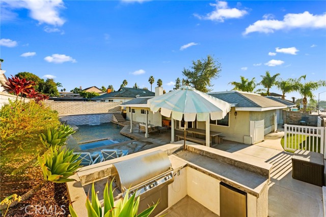 Welcome home to your completely remodeled entertainer's dream with resort-style backyard! This beautifully remodeled four-bedroom, two-bath home showcases an open floor plan and modern finishes throughout. Enter into the spacious great room that flows into the large, upgraded kitchen featuring an expansive island with counter seating and custom beverage bar in the dining area, great for entertaining guests. Step outside the great room to your own private paradise featuring a sparkling pool with a relaxing Baja shelf, waterfall feature, and color-changing lights. The backyard also boasts a custom-built BBQ island and bar with a commercial-grade grill, outdoor audio system, TV hookups, and a covered patio — perfect for hosting flexible gatherings or enjoying peaceful evenings at home. More flexible outdoor living extends from the kitchen into a private courtyard, perfect for enjoying a relaxing moment. The primary suite boasts a large, walk-in closet and dual sinks in the remodeled en-suite. Thoughtful updates include a newer roof (approx. 10 years old), complete PEX re-pipe, tankless water heater, and a Halo 5 whole-home water filtration system. The HVAC system was also replaced and upgraded with HEPA and UV filtration, along with new ducting, ensuring year-round air quality and efficiency. This home combines style, function, and resort-inspired outdoor living — making it truly one of a kind.