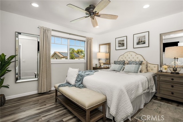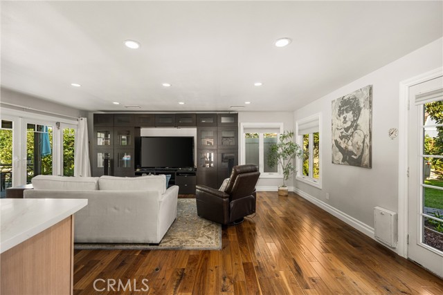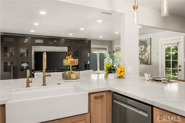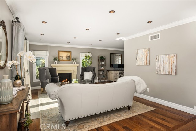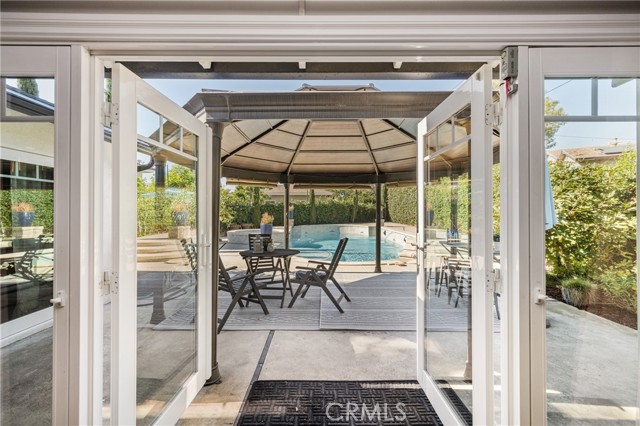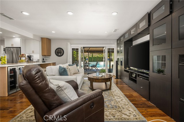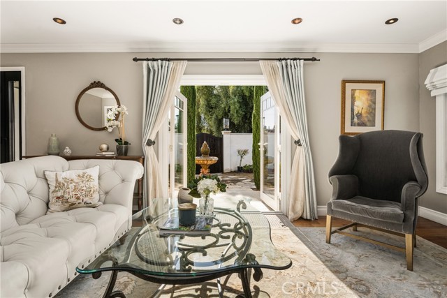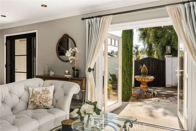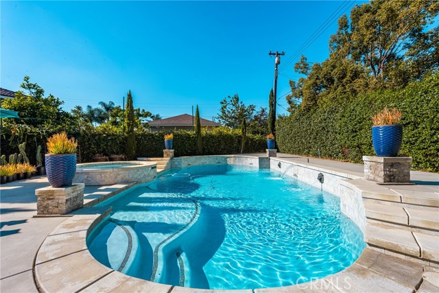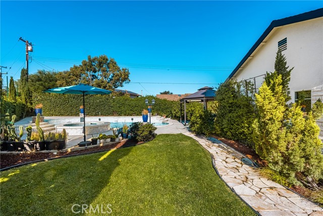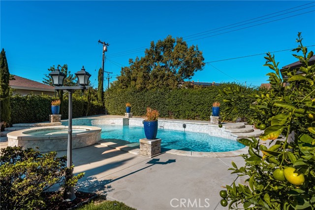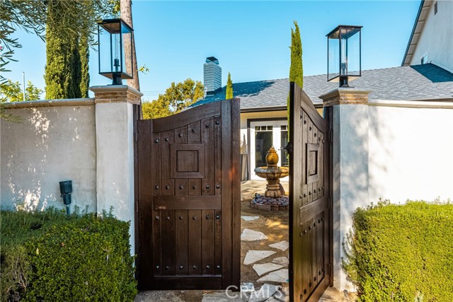 Welcome to this stunning European-inspired residence, offering timeless elegance and modern upgrades throughout. Situated on a large, beautifully landscaped lot, this approximately 2,100 sq. ft. home features 4 bedrooms and 3 bathrooms — designed for both comfort and sophistication. From the moment you arrive, you'll be captivated by the home's striking curb appeal, highlighted by a graceful S-shaped front wall with custom outward-swinging barn doors that create a grand and inviting entrance. Beyond the gates, lush greenery and vibrant gardens set the tone for the serene outdoor oasis that awaits. The property boasts a variety of fruit trees, including mature avocado, lemon, fig, mango, banana, and dragon fruit — creating a private garden paradise. The exterior is finished with durable 50-year Tex Cote paint, ensuring both beauty and long-lasting protection. Inside, you'll find an inviting living area featuring gleaming wood flooring, dual-pane windows, and an elegant fireplace that anchors the space in warmth and style. The open layout flows seamlessly into a fully remodeled custom kitchen, complete with high-end finishes, modern appliances, and exquisite craftsmanship. Each remodeled bathroom reflects thoughtful design and luxurious comfort, evoking a spa-like ambiance. The primary suite is a tranquil retreat filled with natural light, luxurious flooring, and a beautifully updated en-suite bathroom. Additional bedrooms continue the theme of comfort and elegance — ideal for family, guests, or a home office. Step into the backyard and experience the ultimate entertainer's paradise. This expansive outdoor space features a sparkling pool, multiple lounging and dining areas, and lush landscaping that creates a peaceful resort-style setting. Whether hosting weekend gatherings or enjoying quiet evenings under the stars, this backyard was made for unforgettable memories. Additional features include solar panels, ample parking, and meticulous landscaping that enhances the property's European charm and sense of tranquility. This exceptional home seamlessly blends European character, modern luxury, and the best of Southern California outdoor living.