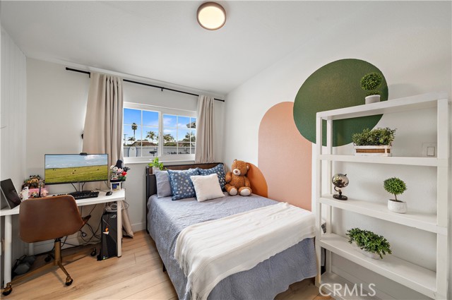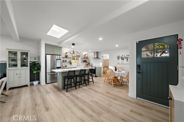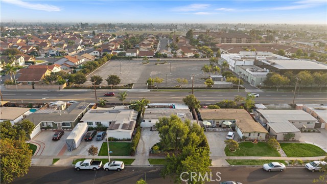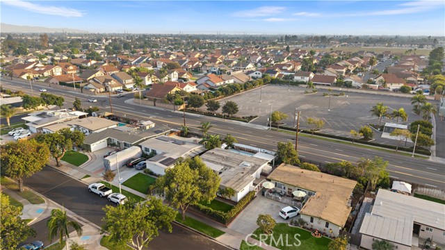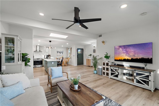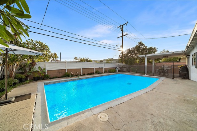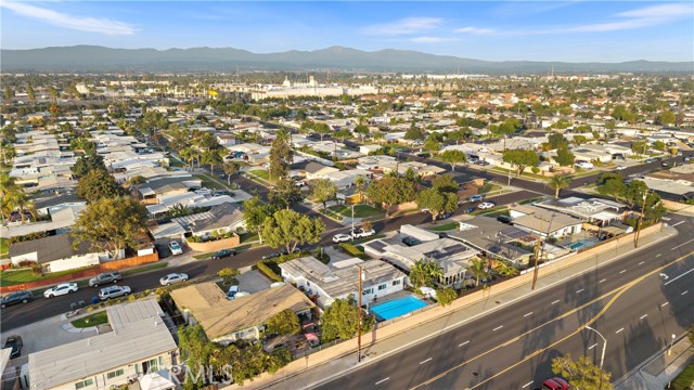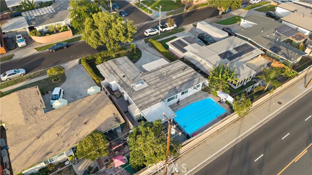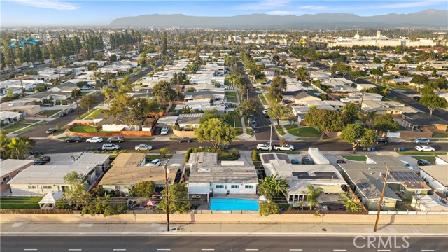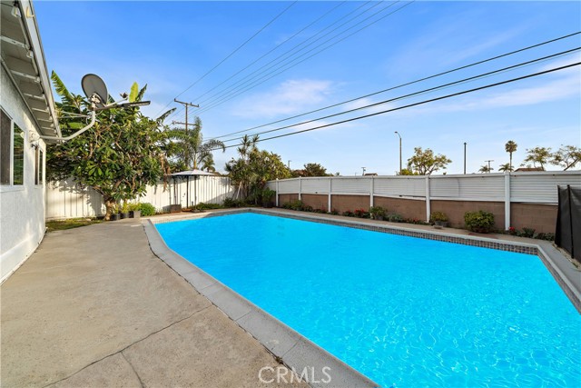 Absolutely stunning pool home, this charming 1955 Buena Park Estates home has been completely reimagined from top to bottom with exquisite modern luxury finishes, offering 4 bedrooms, 2 baths, and 1,273 square feet of sun-drenched open-concept living space in a well-established, family-friendly neighborhood just a stone's throw from Knott's Berry Farm and close to premier shopping, dining, and freeways; the beautifully fenced front yard showcases wrought-iron accents, manicured lawn and gardens, an extra-long sweeping driveway, and a welcoming covered porch/patio, while inside, the midcentury modern single-story design has been transformed to impress with wide-plank luxury vinyl wood flooring, dual-pane windows, LED recessed lighting, tall baseboards, raised-panel interior doors, shiplap feature walls in two bedrooms, ceiling fans, central A/C, and a skylit great room that seamlessly blends the living area, dining space, and a chef's dream kitchen appointed with quartz countertops, full-height designer tile backsplash, a large center island with wrap-around seating, chic floating shelves, custom soft-closing cabinetry, stainless steel appliances, and a farmhouse sink; the all-new hall bathroom features designer tile flooring and shower surround with frameless glass enclosure, upgraded vanity, and floating decor shelves, while the primary suite offers a stylish barn door leading to a spa-like ensuite with marble vessel sink and walk-in tiled shower; the 4th bedroom with open-beam ceiling is currently used as an office, and the two-car garage has been thoughtfully divided into a 5th bedroom, laundry room, and long walk-in storage closet; dual-pane sliders open to the entertainer's backyard with sparkling pool, child-safety fencing, covered patio, and lush foliage — an absolute must-see modern masterpiece!