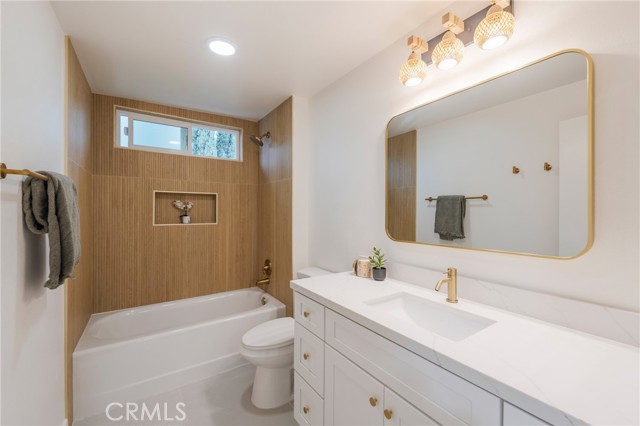 Welcome to this beautifully renovated Glenbrook Community home with a 3-car garage, where modern design meets luxurious comfort. Located in a highly desirable neighborhood in Brea, CA. This stunning property boasts a spacious open floor plan with 5 generously sized bedrooms and various premium features that elevate your living experience. There are 2 bedrooms downstairs, including a primary suite with another 3 bedrooms upstairs with an EXTRA primary suite. There are peek a boo views from 2 bedrooms upstairs. Four (4) full bathrooms have been tastefully renovated with modern mid-century touches. Step inside through a beautiful custom wood double door and be greeted by an inviting ambiance, enhanced by recessed lighting, new whisper-white interior paint, and premium laminate wood flooring throughout the entire home. The heart of this home is the chef-inspired kitchen, complete with gleaming quartz countertops, all-new stainless steel appliances, shaker-style slow-close cabinetry, and a custom peninsula, perfect for both cooking and entertaining. There is a warm and inviting family room and a separate formal living room, which features a beautiful fireplace, providing a perfect setting for relaxing. This home offers a 3-CAR GARAGE providing ample storage or to use as a gym/hobby space. Enjoy the large and private backyard to host all of your special gatherings. With its thoughtful design, premium finishes, and a fantastic layout, this home is the perfect blend of modern living and comfort. Great location with award-winning Brea-Olinda school district, don't miss this chance to make this property your DREAM HOME!