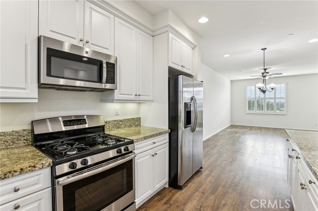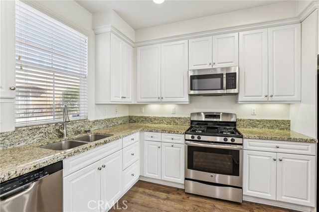 Welcome to 133 Aliso Ridge Loop, a beautifully appointed home in the sought-after Ridge community of Mission Viejo. The entry level offers a private front patio with sweeping sunset, city light, and mountain views, plus a bedroom with an ensuite bath and direct access to the two-car garage. The main level features an open-concept design with laminate wood floors, plantation shutters, and recessed lighting. The living and dining areas flow seamlessly into the chef's kitchen, showcasing granite countertops, white cabinetry, a spacious center island, and stainless steel appliances, with a door leading to a private balcony. A powder room and full-size laundry room add convenience. Upstairs, the primary suite boasts dual vanities, a soaking tub, walk-in shower, and generous walk-in closet, while a secondary bedroom enjoys its own ensuite bath. The community offers a pool, spa, and playground, all within close proximity to shopping, dining, schools, and parks.
