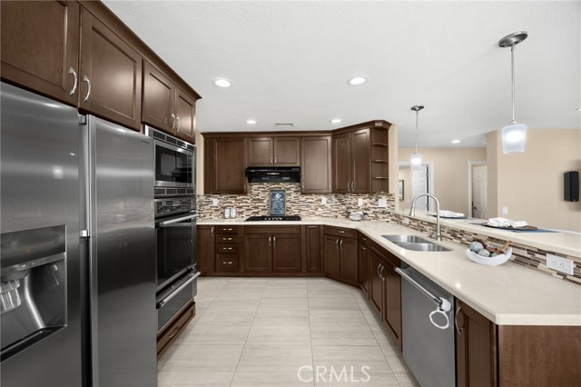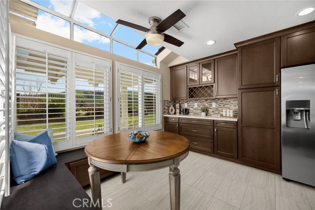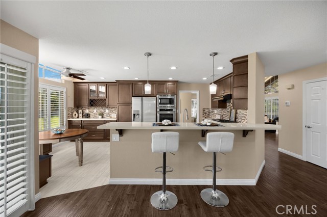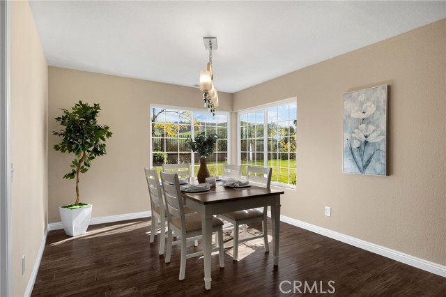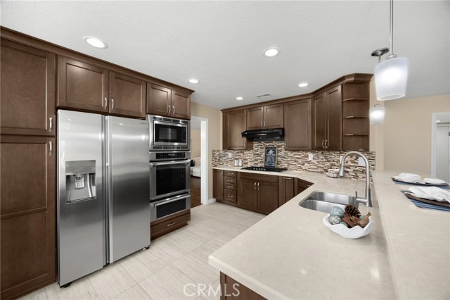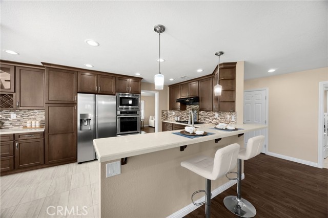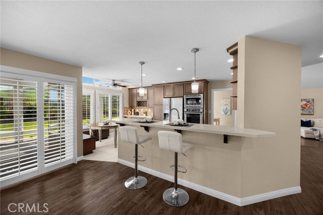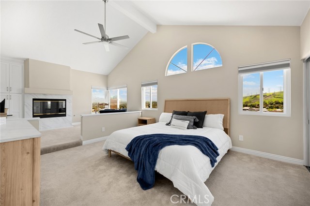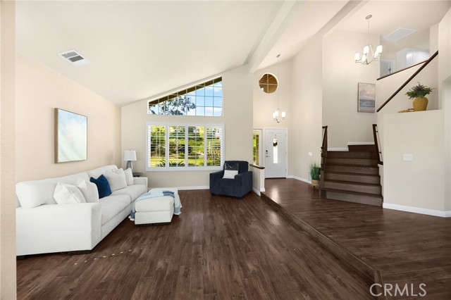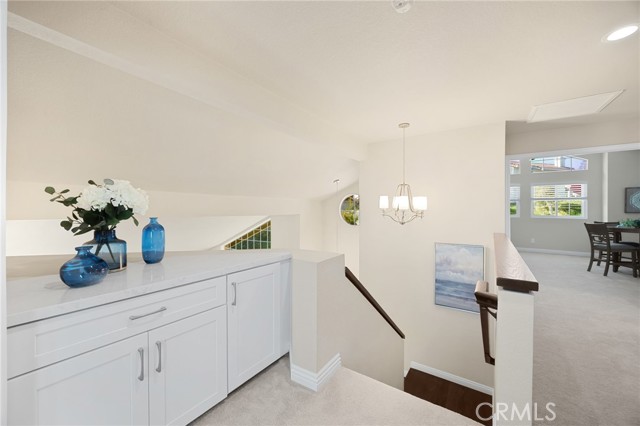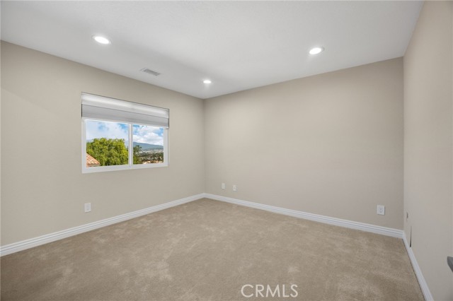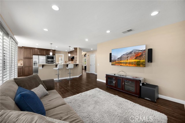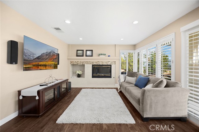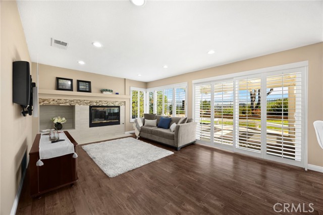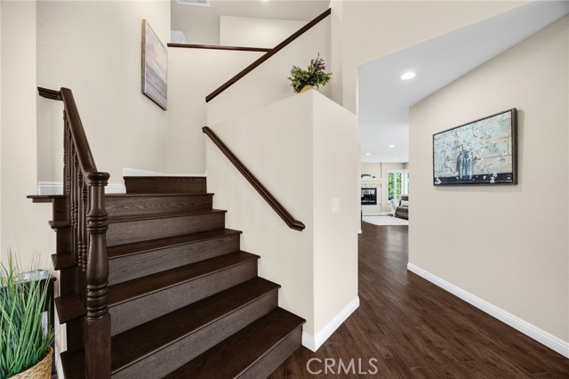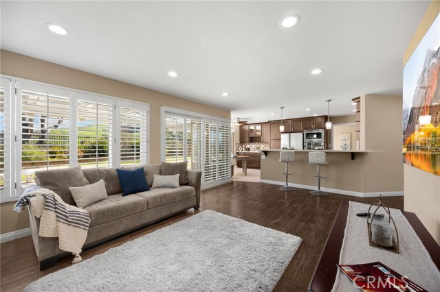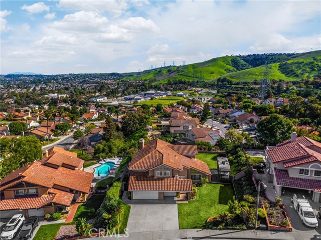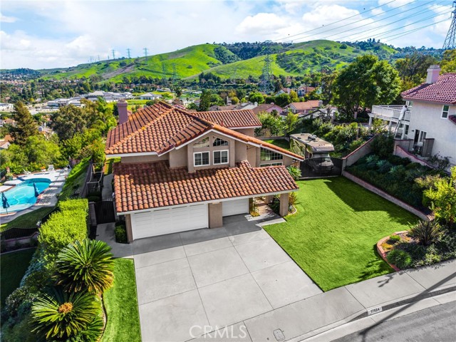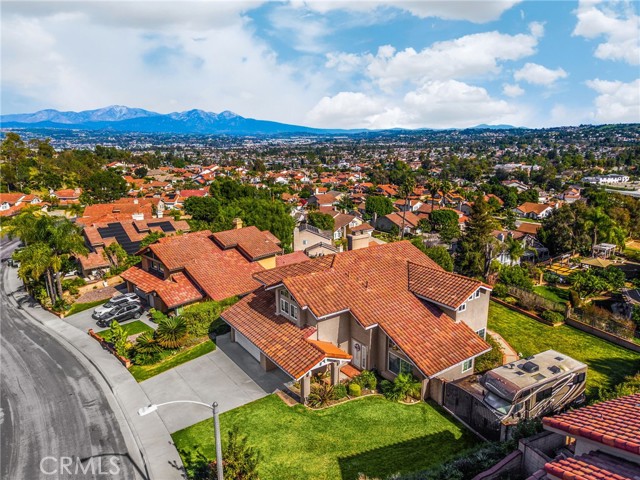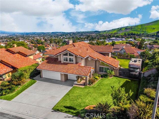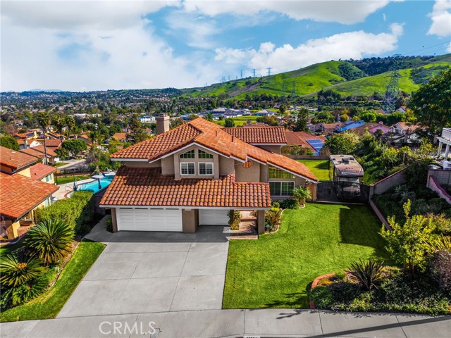Lovely 4-bedroom, 3-bath home with a bonus room or optional 5th bedroom, located in a desirable area of Rowland Heights. From the moment you step inside, you'll feel the warmth of the beautiful dark wood flooring in the formal living room dining area complemented by an abundance of natural light from the many windows throughout. The kitchen features rich dark wood cabinetry, an earth-tone backsplash, and a dedicated wine area that also works perfectly as a coffee bar. The breakfast bar comfortably seats up to three, while the cozy kitchen nook is an ideal spot to enjoy your morning coffee. The kitchen opens seamlessly to the family room, filled with natural light from multiple windows and a sliding glass door — creating a bright and inviting space for everyday living. The main level includes a downstairs bedroom, a laundry room with direct access to the 3-car garage with built-in cabinetry for added storage. Upstairs, the primary suite offers a private retreat area with a fireplace and windows with unobstructed mountain views. The primary bathroom features dual sinks with touch-light mirrors, a separate shower, and a relaxing soaking tub. Adjacent to the primary suite is another spacious room that can easily serve as an additional large bedroom or bonus room. The two remaining bedrooms are generously sized, with the rear bedroom also enjoying beautiful view outlooks. The backyard offers a spacious patio with seating, perfect for entertaining or simply enjoying the open views. Along the side of the home, you'll find RV parking, enhanced by a unique feature: a concrete base installed beneath the front yard lawn, allowing a mobile home, RV, or trailer to be moved in and out without damaging the grass — while still maintaining the home's lush curb appeal.