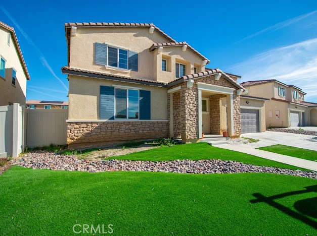 Spacious 3013 sq ft 5 Bedroom, 3 Bath, open floor plan home on a premium size lot located in the gated Community of Olivewood. This beautiful home features, large island with bar seating, walk in pantry and stainless steel appliances in the kitchen, a bedroom and full bath on the main floor, tandem 3 car garage with a side door to the backyard. On the second floor you will find a large loft, laundry room, the main bedroom with dressing area, walk in closet, linen closet, separate vanities, three additional bedrooms plus a second full bath. This home is located near the 10/60 fwy and shopping. Enjoy the resort style HOA amenities which include, pool and spa, splash pad, community park, picnic area, basket ball court, walking trails and clubhouse. This beautiful home comes with PAID SOLAR!