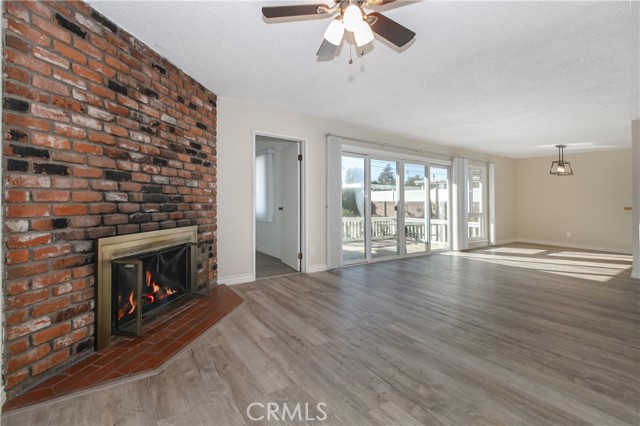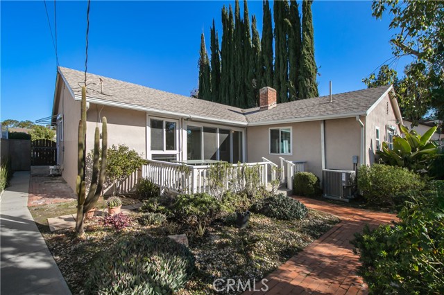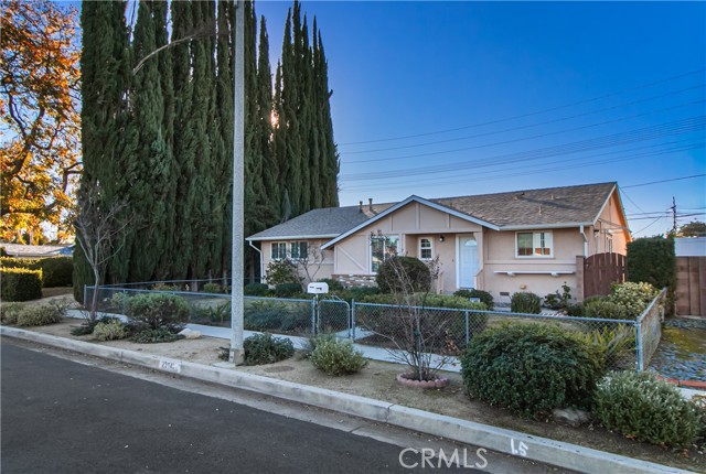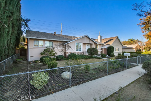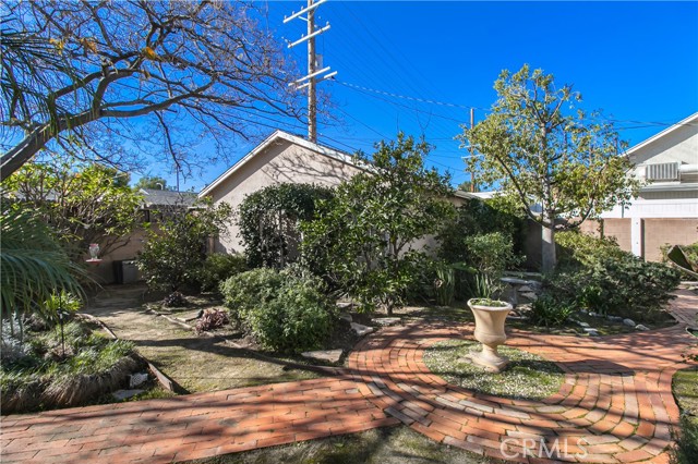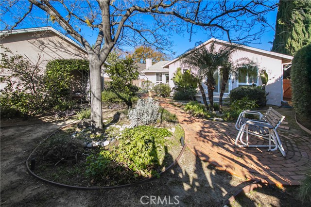 This single-story residence features four bedrooms and three bathrooms; all conveniently located on one level. The interior boasts a kitchen with an adjoining dining area featuring a pass-through window. Separate dining room, and a family room enhanced by a brick fireplace, providing multiple spaces for daily living and entertaining. The layout is designed to be light and open, contributing to a spacious atmosphere throughout the home. Newer windows and doors not only enhance the home's aesthetic but also contribute to increased energy efficiency. Wood floors are throughout. For added convenience, the separate indoor laundry room is complete with a sink. Outdoor living is facilitated by two patios: one accessible from the family room and another private patio off the master bedroom. The rear yard provides a tranquil retreat, featuring a brick walkway that winds through flowers and fruit trees, creating a Zen-like ambiance. Elements such as brick pathways, flowers, and fruit trees can contribute to a peaceful garden setting. A detached two-car garage completes this home, offering the possibility of additional storage or workspace, or potentially an ADU.