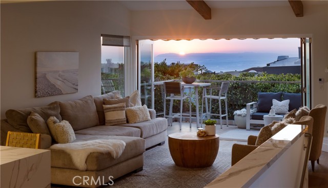 Experience coastal luxury at its finest in this meticulously reimagined Laguna Beach residence. Positioned to capture breathtaking panoramic views of the Pacific Ocean, Catalina Island, and San Clemente Island, this 3 bedroom, 2.5 bathroom home perfectly balances modern industrial design with high-end sophistication. Every inch of this property has been thoughtfully upgraded, from the striking new steel roof and Mulholland steel fencing to the custom walnut doors and wide-plank white oak hardwoods that flow throughout the upper level. The heart of the home resides upstairs in the light-filled ocean view great room, which features a marble-mantel gas fireplace and an industrial steel ceiling fan. Indoor-outdoor living is perfected here via a wall-to-wall accordion sliding door that opens completely to a newer glass-enclosed upstairs patio, creating a seamless transition for entertaining against the backdrop of world-class sunsets. The adjacent chef's kitchen is a showpiece of functional design, anchored by stunning porcelain waterfall countertops and backsplash, soft-close craftsman cabinetry, and a full suite of premium LG appliances. The thoughtful layout places the primary suite on the upper level for maximum privacy and impact. This sanctuary boasts a custom walk-in California Closet and a spa-like bathroom featuring a floor-to-ceiling glass-enclosed wet room with a soaking tub and walk-in shower, floating dual vanities, and the luxury of heated tile floors. The lower level houses the two spacious secondary bedrooms, providing a quiet and separate space for guests or family. These bedrooms share a well-appointed hall bathroom featuring a dual-sink vanity, floating cabinetry, and premium Italian wave tile. For added convenience, the home includes a dedicated interior laundry room featuring a side-by-side washer and dryer setup. Beyond the aesthetic upgrades, the home offers peace of mind with modern infrastructure, including an upgraded AC condenser, newer radiant forced-air ducting, a tankless water. Ideally situated just steps from the amenities of Moulton Meadows Park — a local favorite for its renowned mountain biking and hiking trails, dog park, and sports courts — this residence places the best of Laguna at your doorstep. Perched just up the hill from the pristine sands of Woods Cove and Victoria Beach, the home offers an unparalleled turn-key lifestyle in one of Southern California's most coveted coastal enclaves.